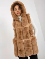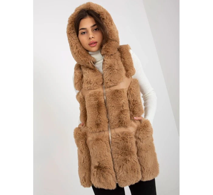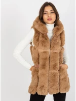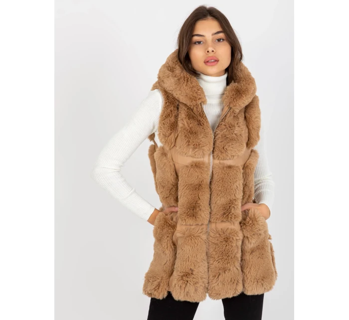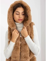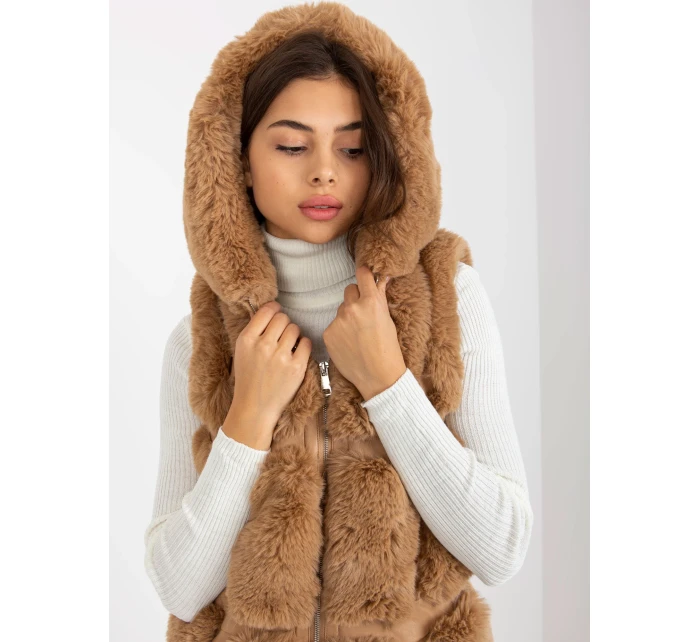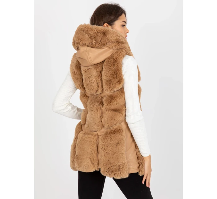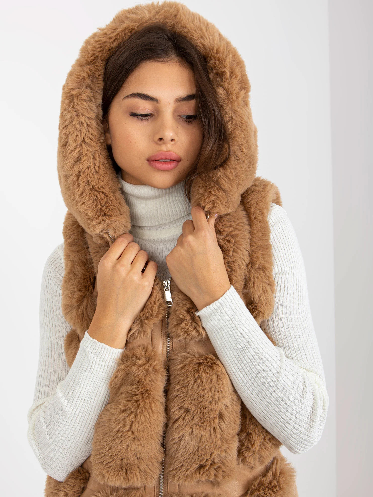 Velbloudí a béžová dámská vesta z ekokůže s kožešinou .
