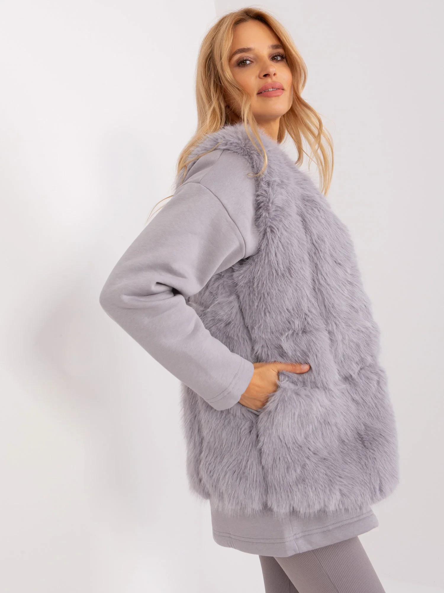 Šedá vesta s kožešinovou podšívkou.