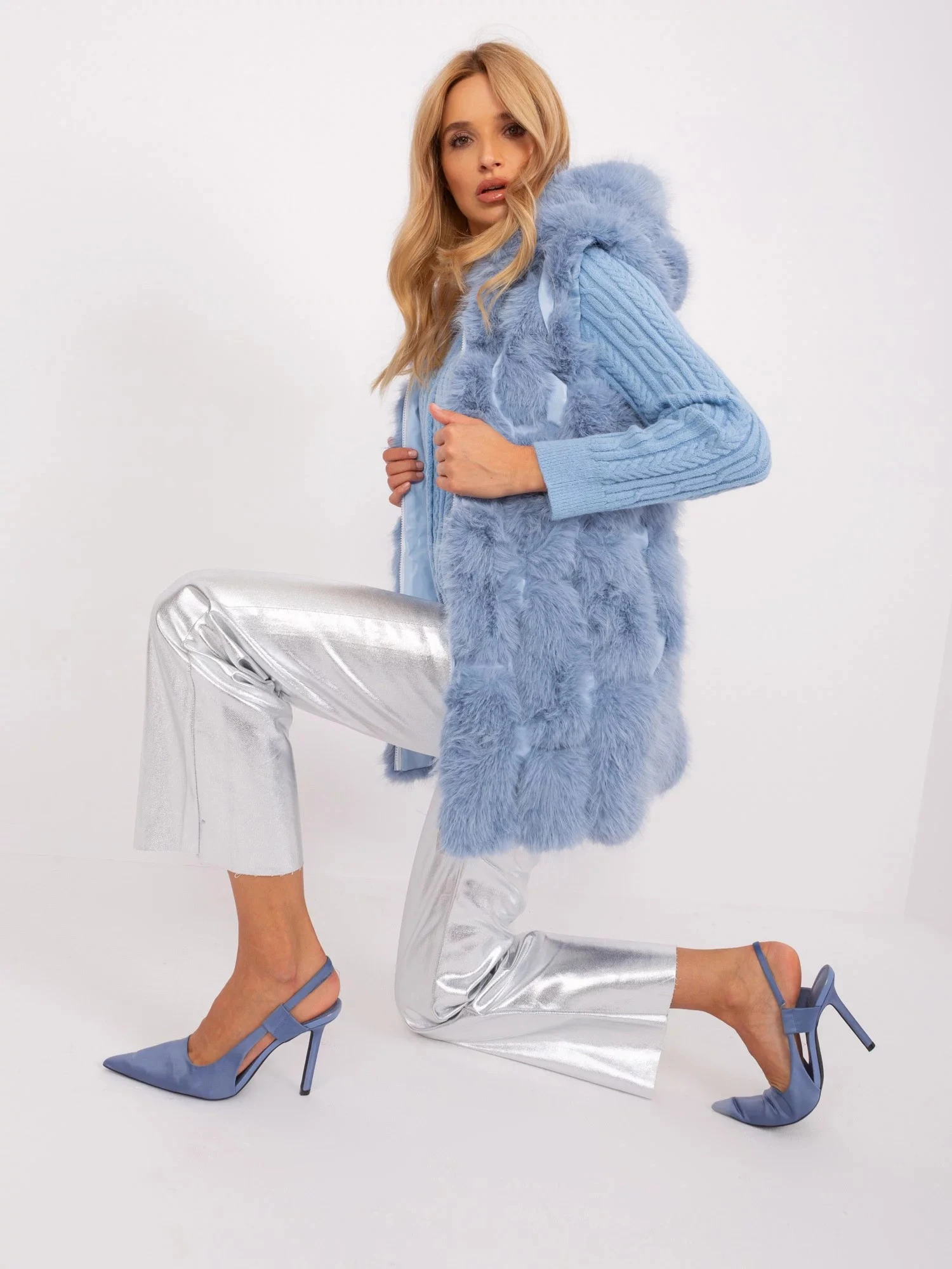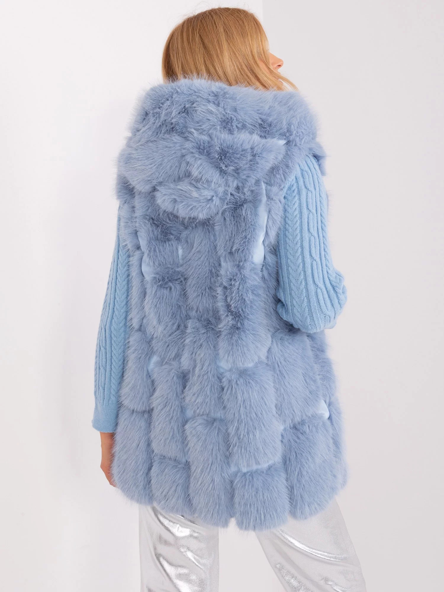 Modrá kožešinová vesta s kapucí.