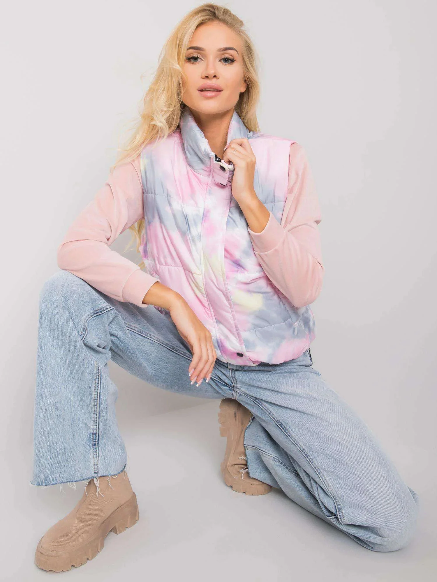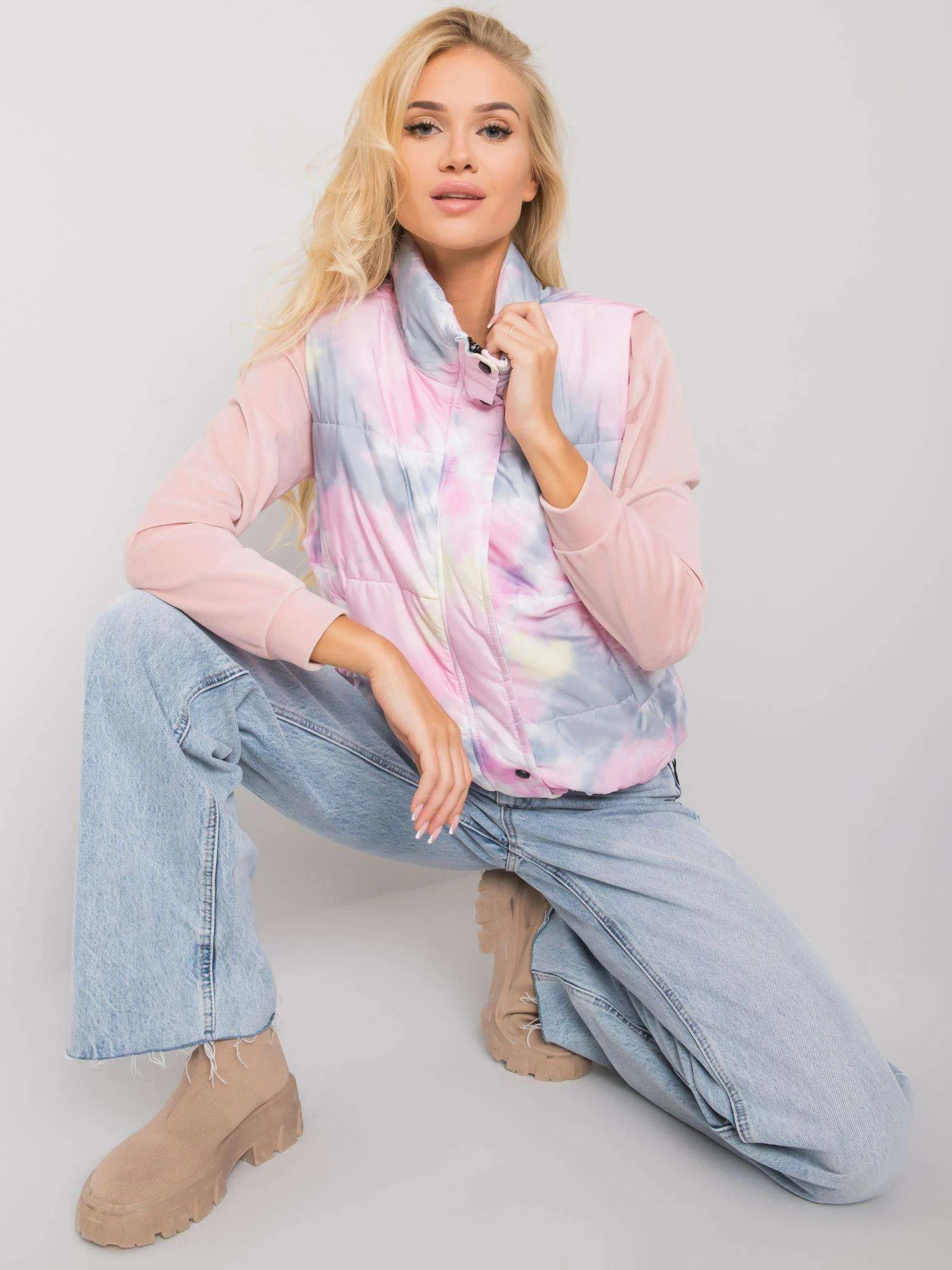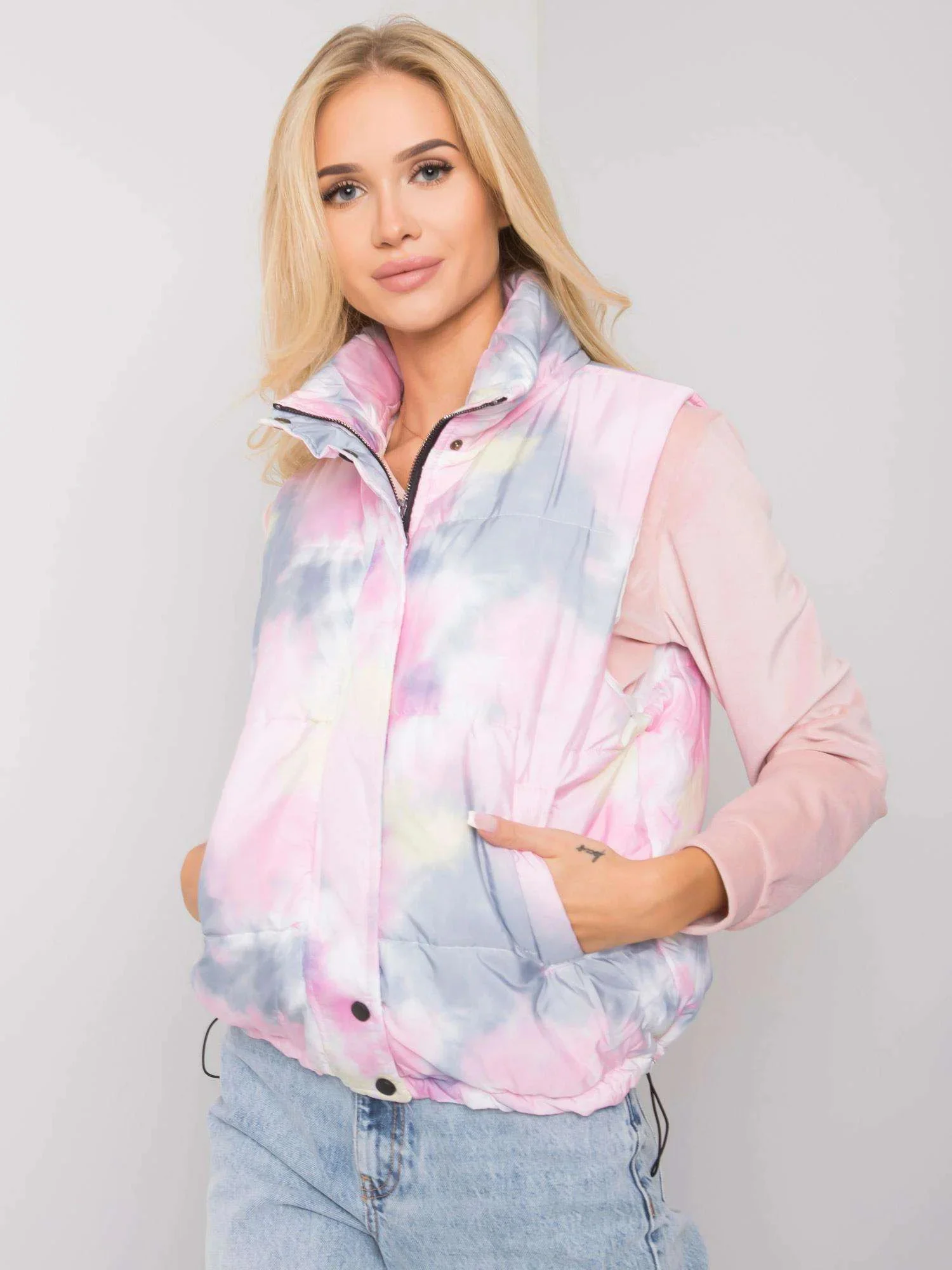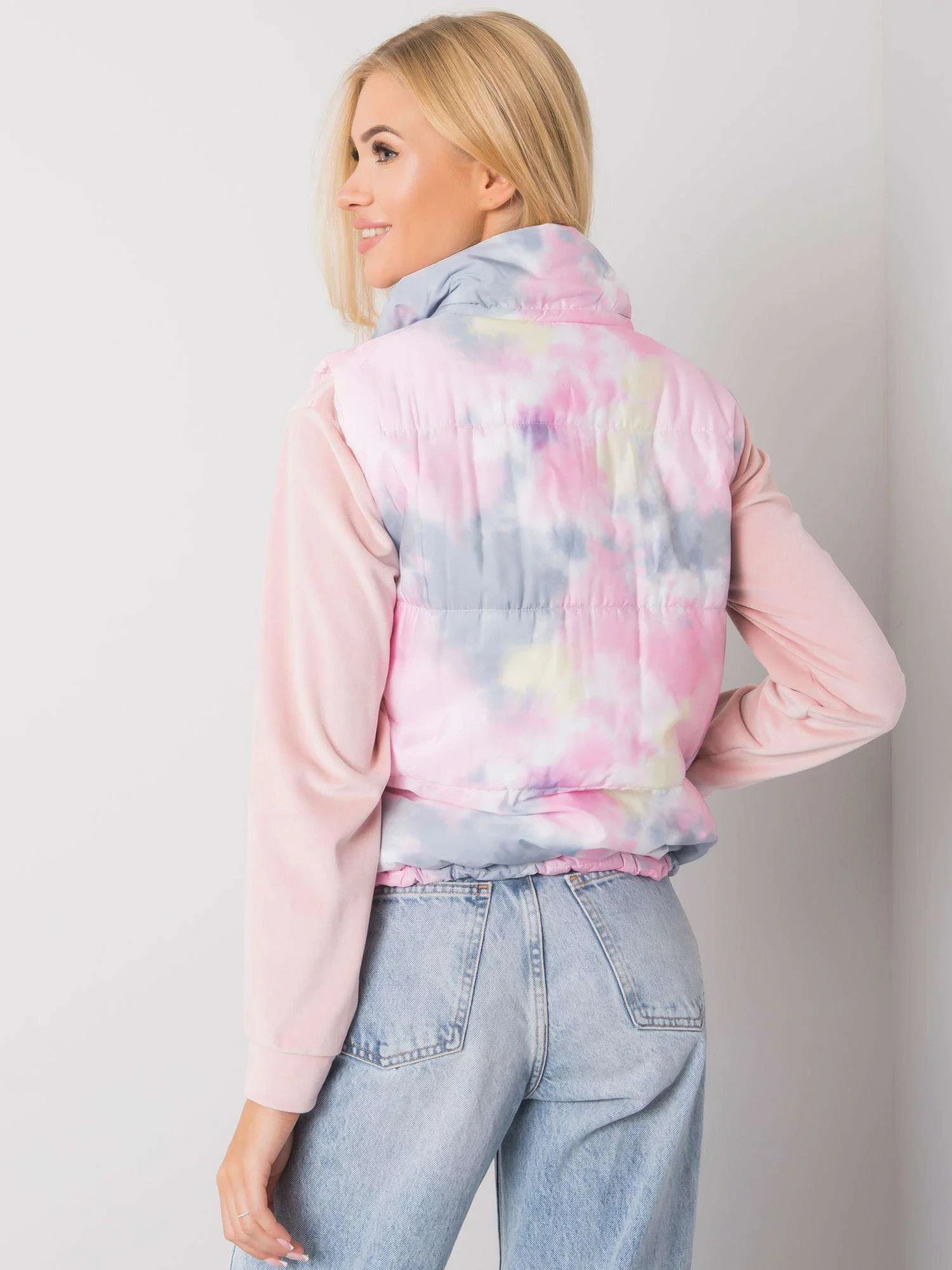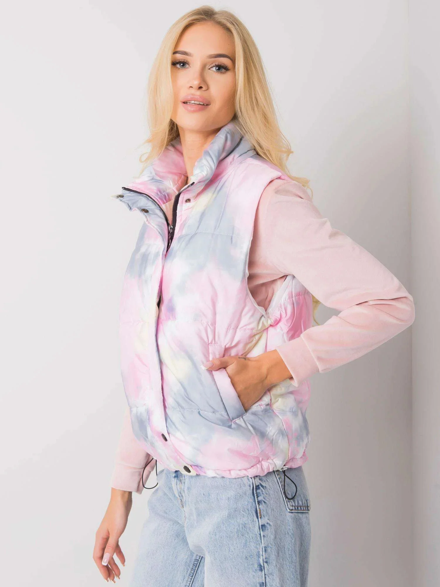 Šedorůžová vesta bez kapuce.