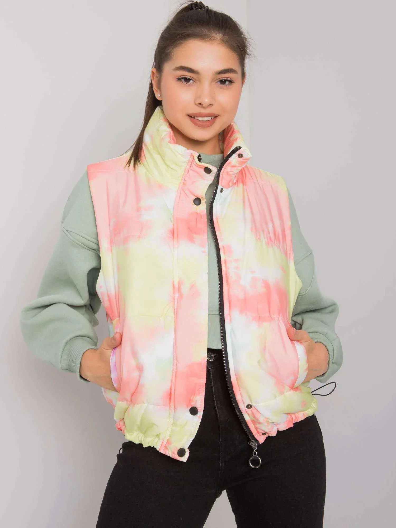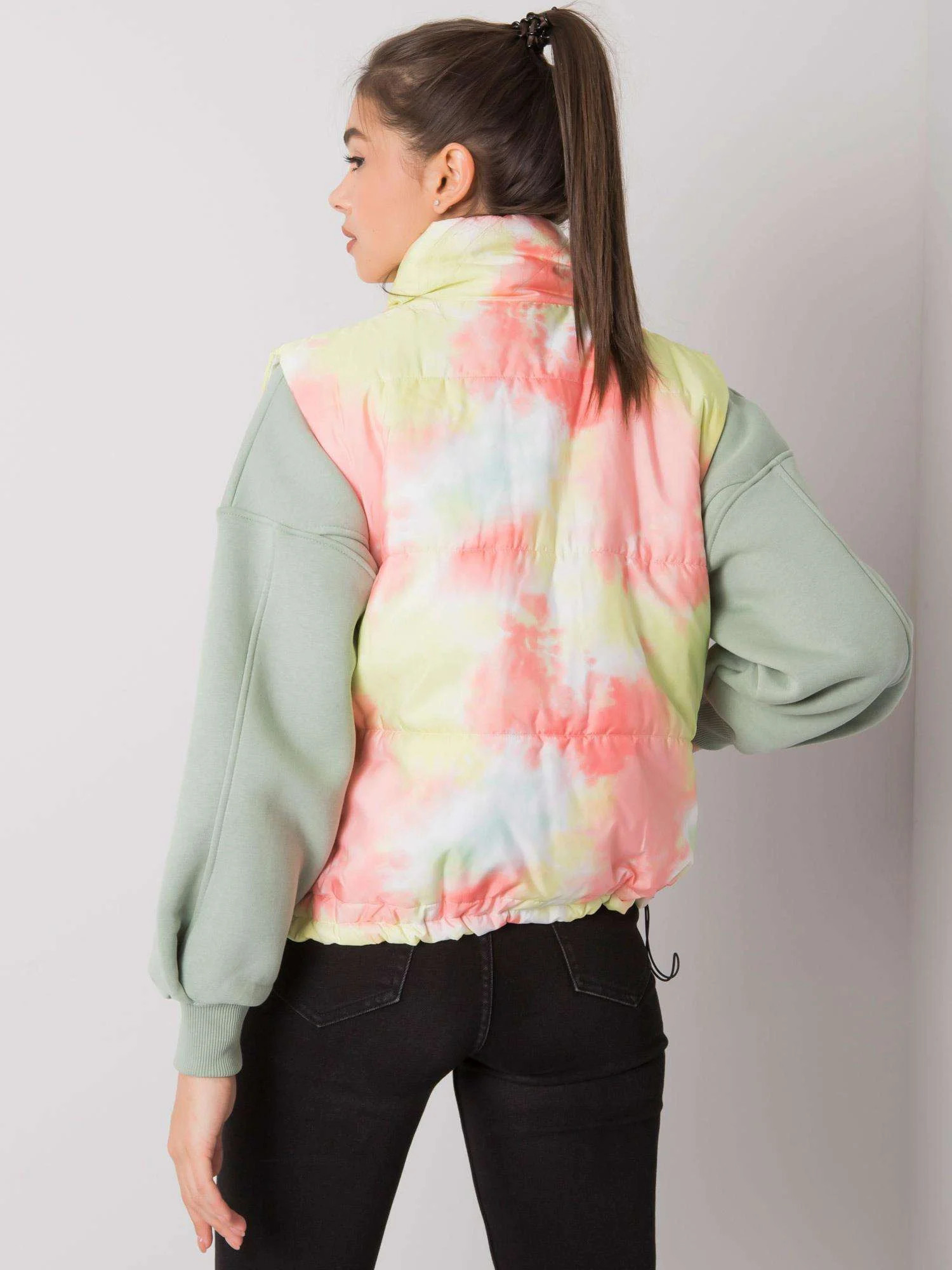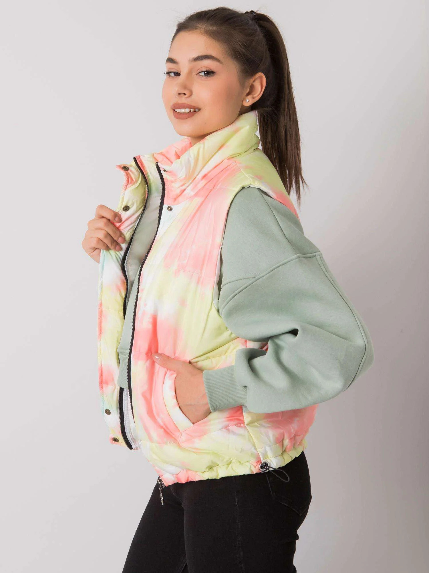 Žlutá a oranžová vesta bez kapuce.
