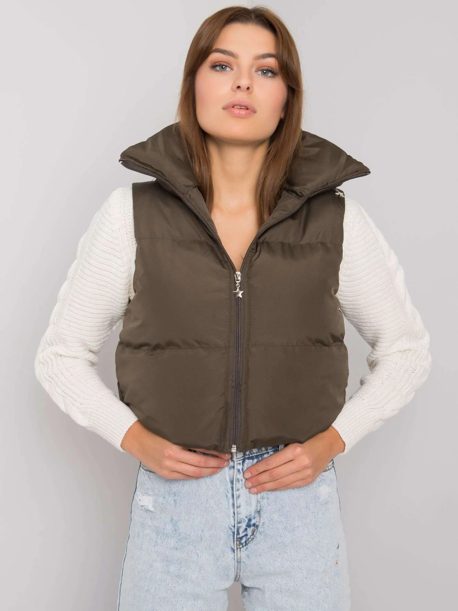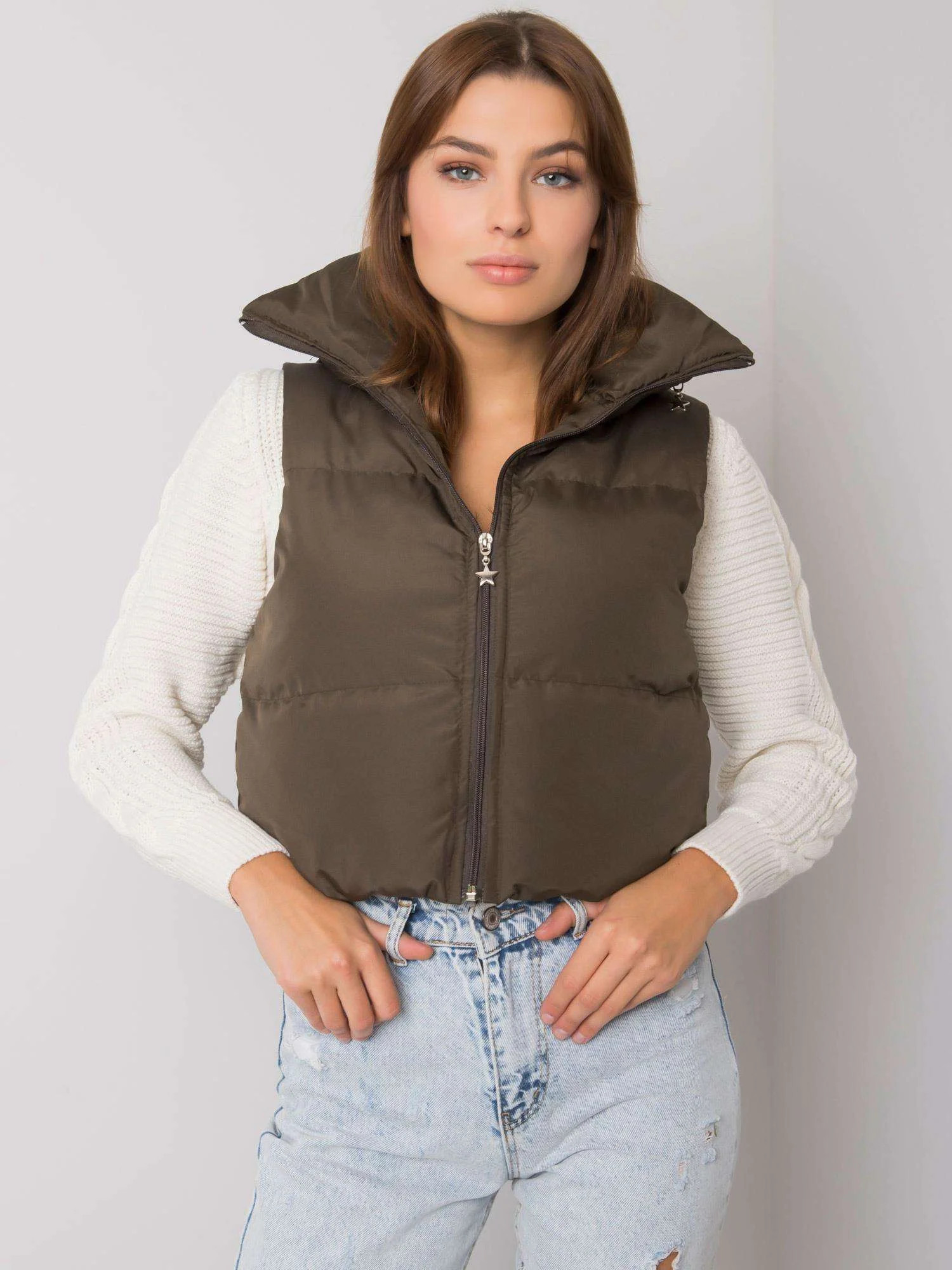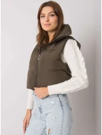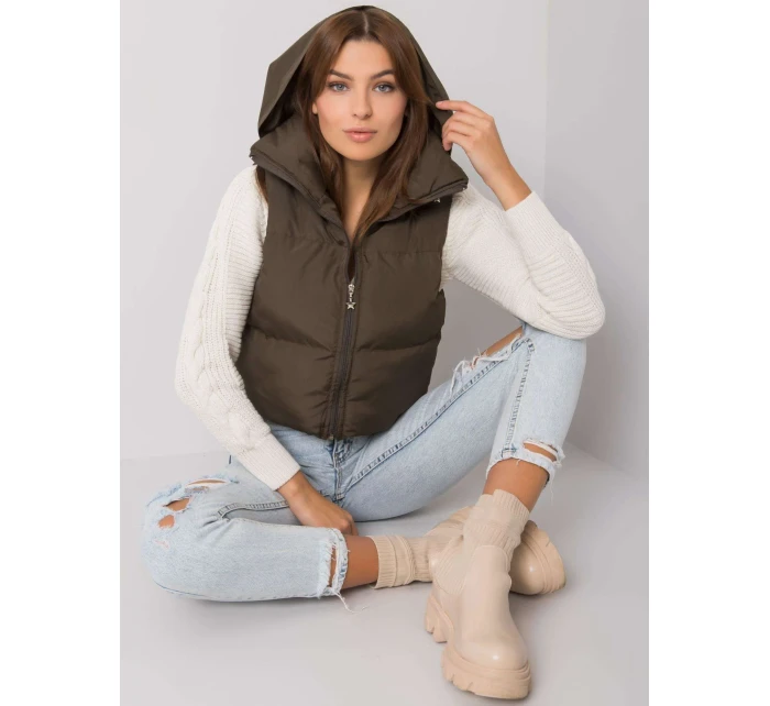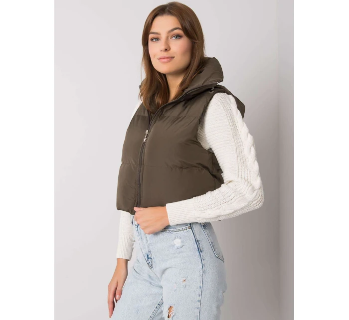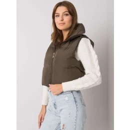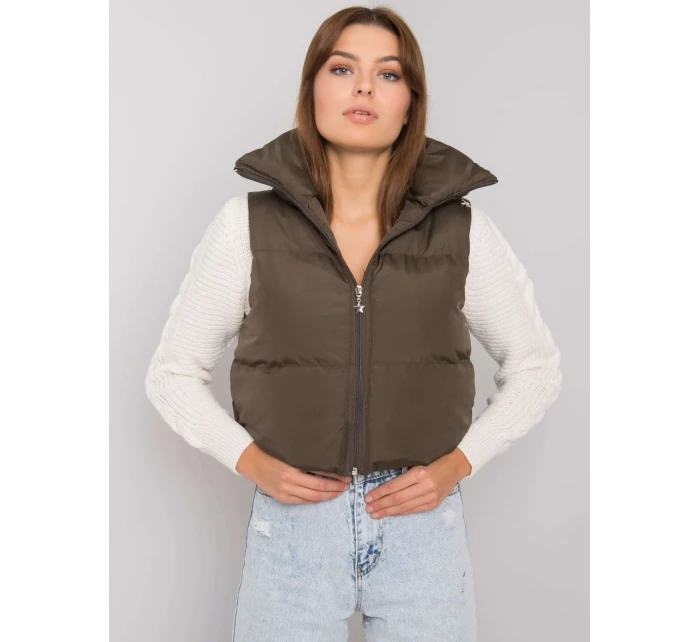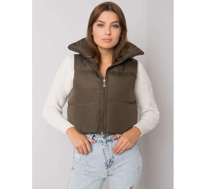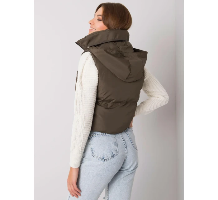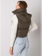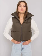 Khaki péřová vesta s páskem a kapsami .