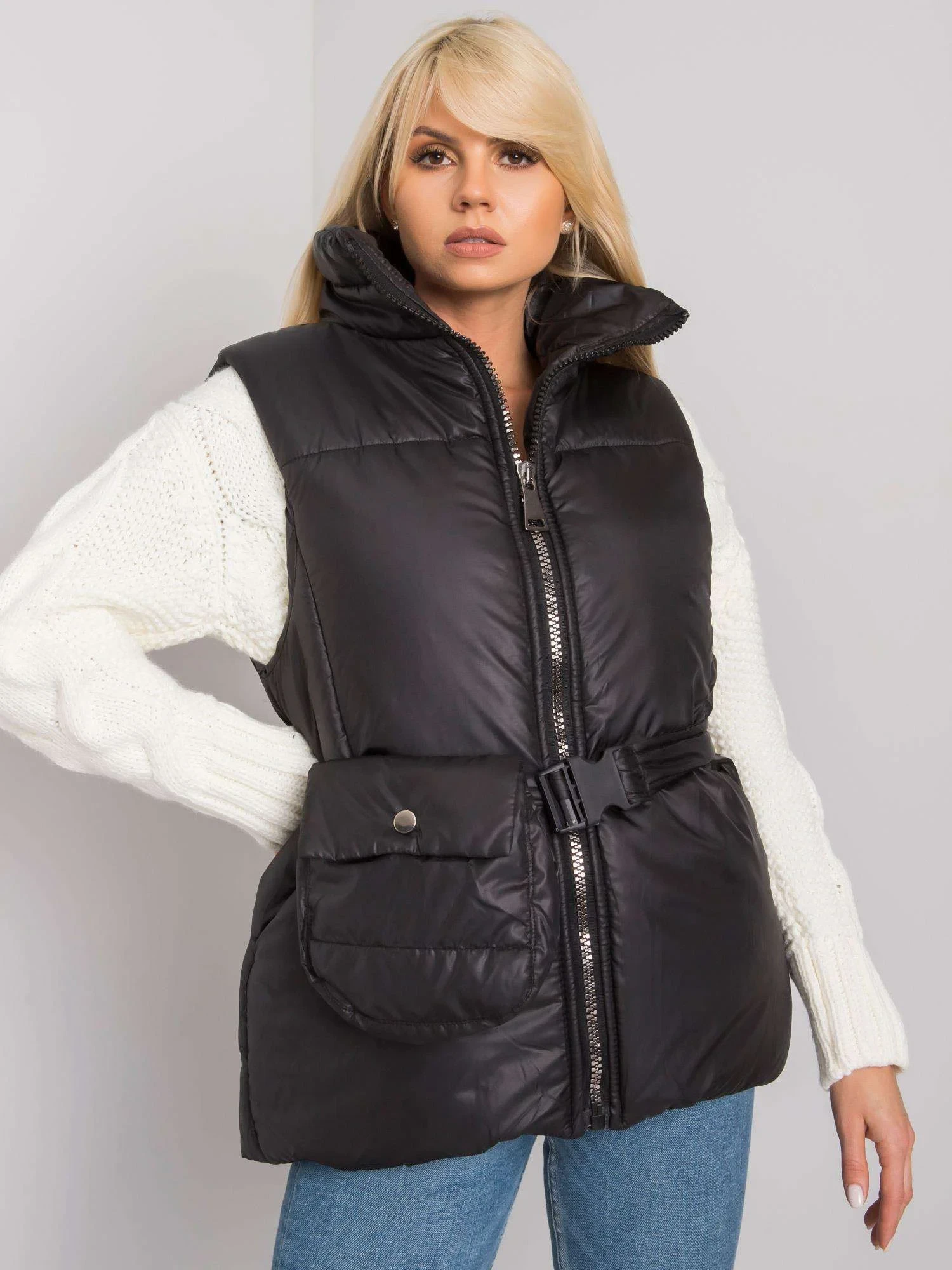 Černá péřová vesta.