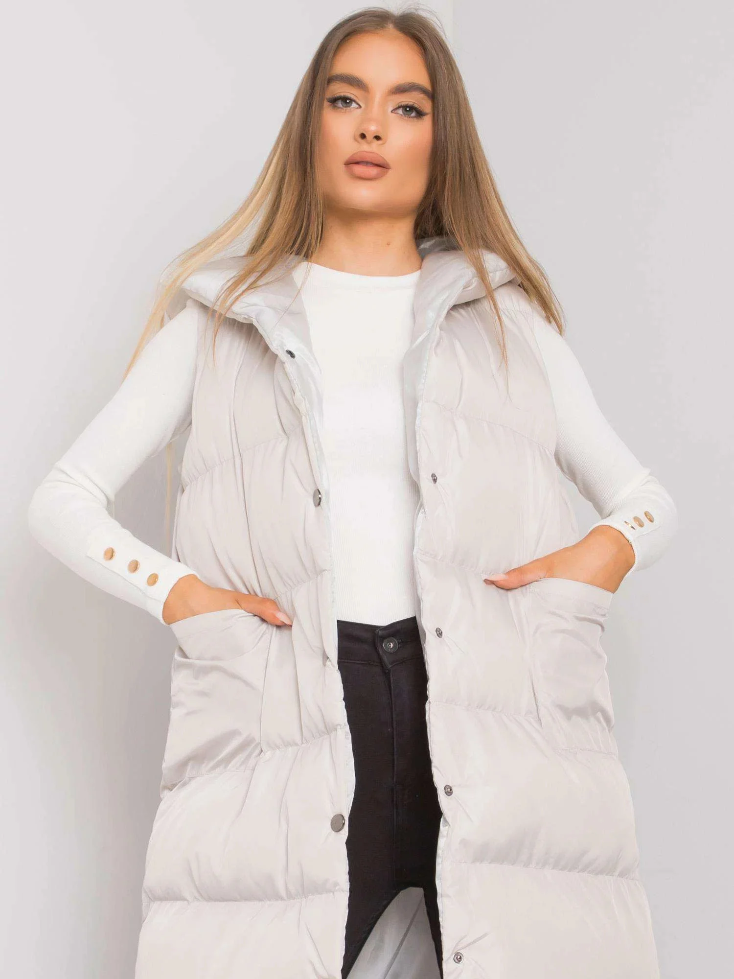 Světle šedá prošívaná vesta pro ženy.