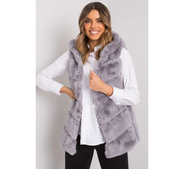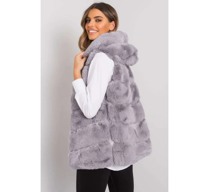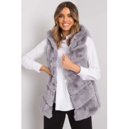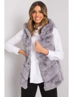 Šedá dámská vesta s kapucí. Vesta se zapíná na háčky, je celá podšitá.