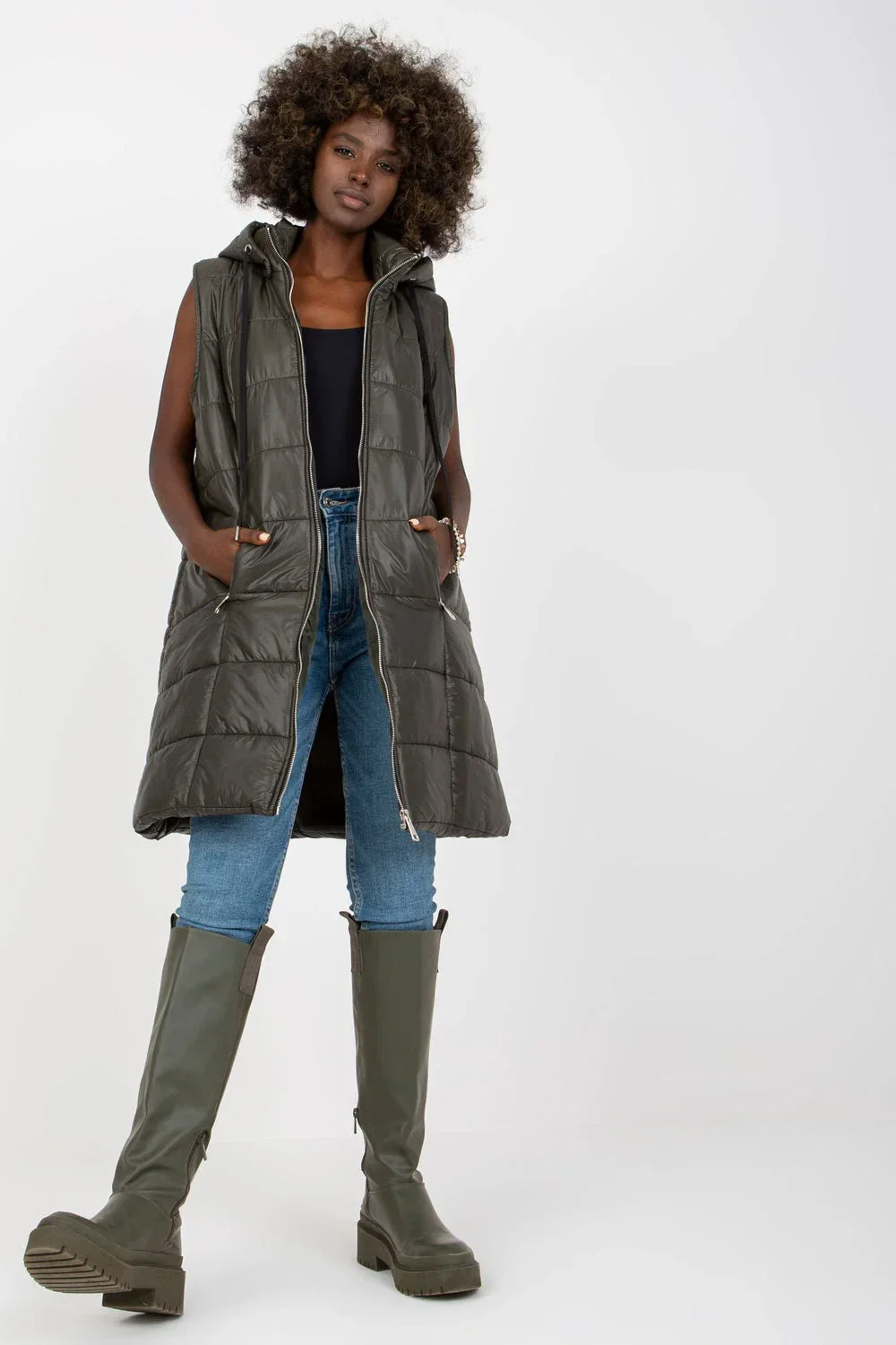 Prošívaná péřová vesta prodlouženého střihu se zapínáním na zip. Vesta s odnímatelnou kapucí, kapsy na zip na přední straně. Plně podšité. Nylon 100 %