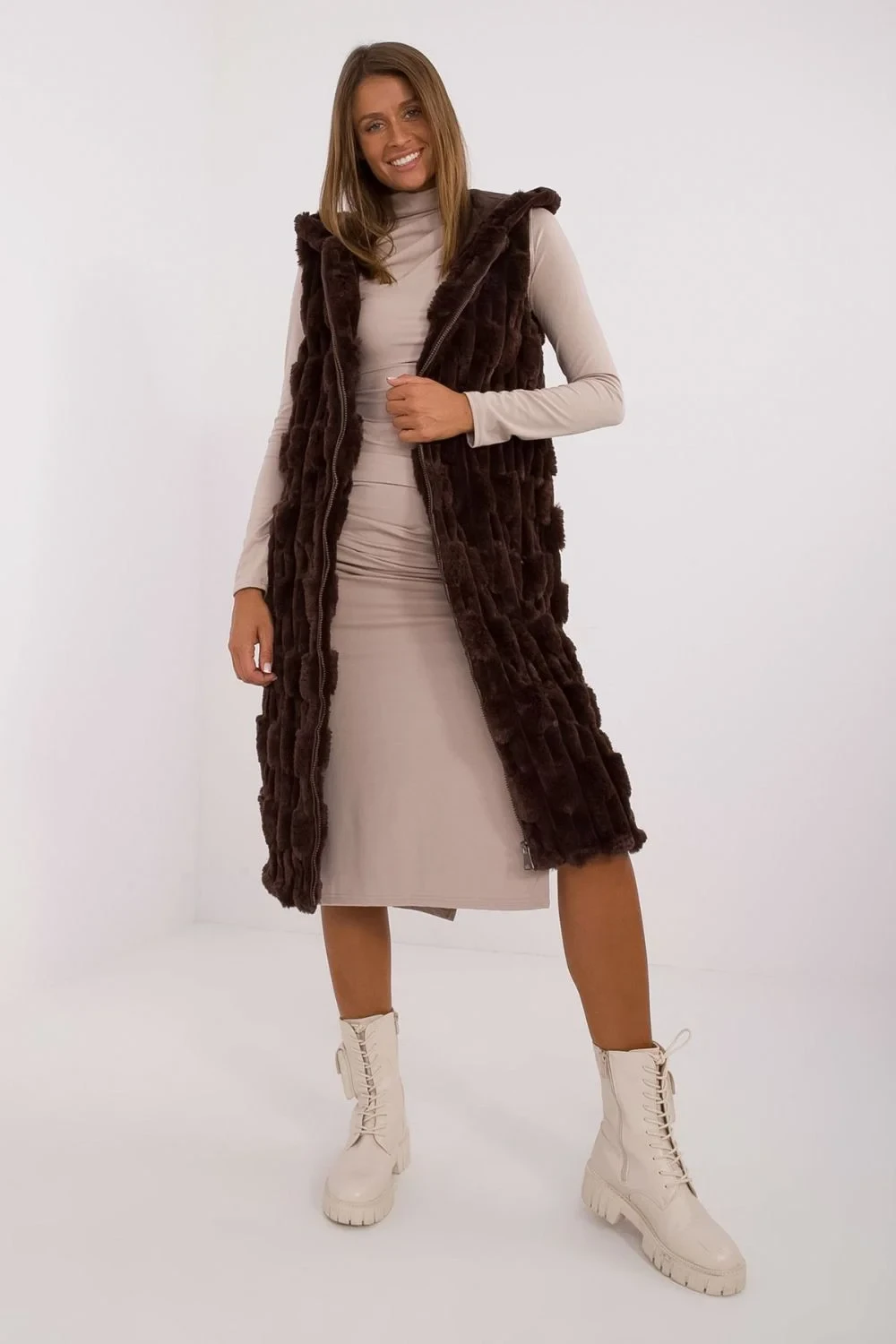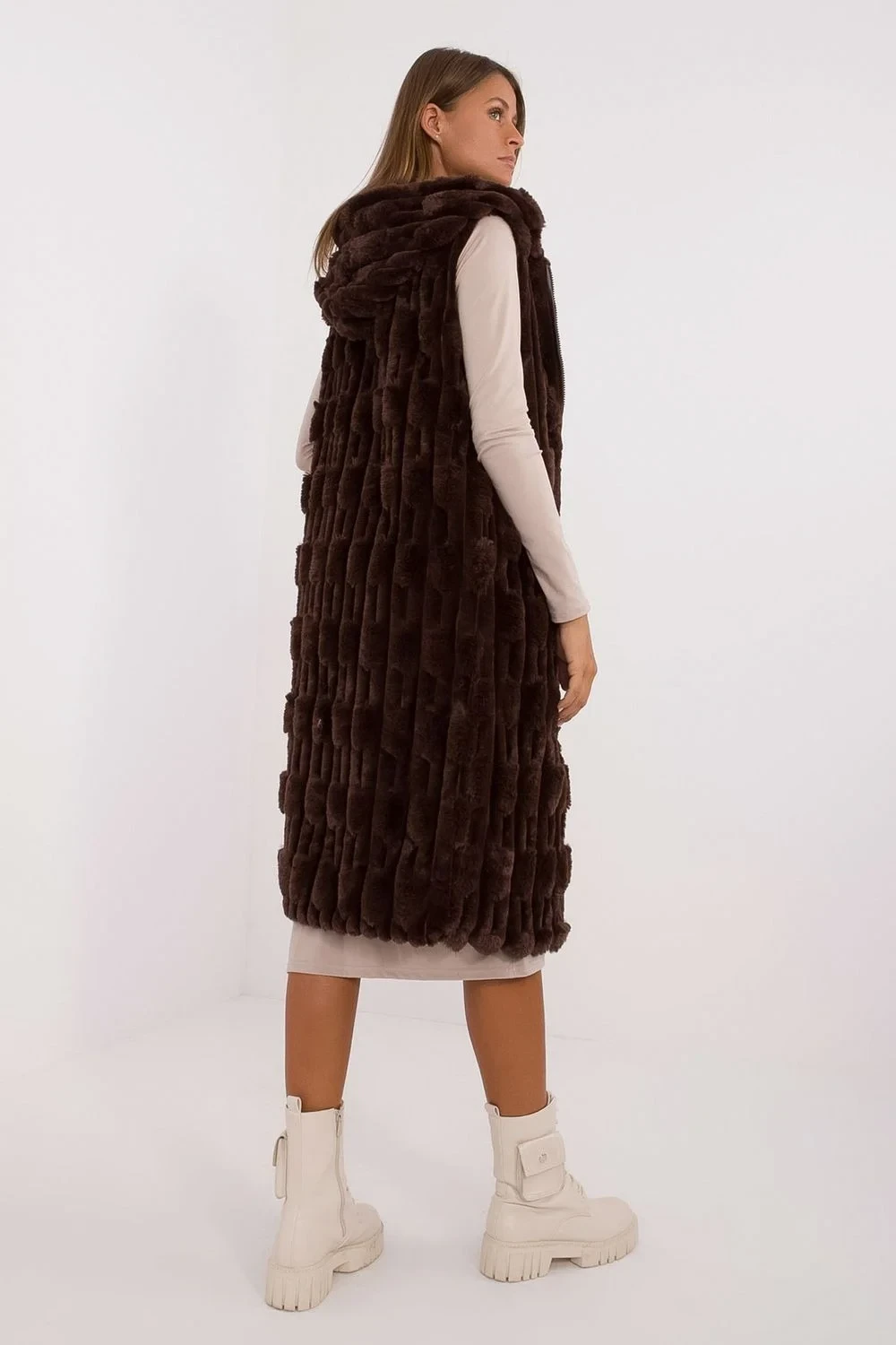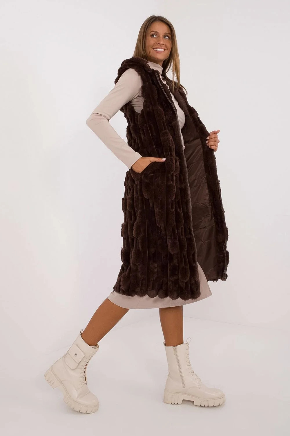 Vytvořená s ohledem na ženy, které si váží elegance a pohodlí, tato kožešinová vesta je výjimečným prvkem vašeho šatníku. Vesta je dokonalou kombinací elegance a pohodlí. Její šlechtický design ji činí ideální pro nošení v formálních situacích, do práce nebo na důležité obchodní schůzky. Díky svému vkusnému charakteru se vesta skvěle hodí jako součást pracovního oblečení a na významné příležitosti, dodávající vaší stylizaci výjimečný charakter. Vesta je vyrobena z odolného a snadno udržovatelného polyesteru. Tento materiál nejen vypadá luxusně, ale také poskytuje pohodlí nošení. Kožešinová vesta je určena na chladné dny, skvěle chrání před chladem a zároveň dodává elegance každému outfitu. Vesta je vybavena subtilní, ale účinnou izolací, což ji činí nejen módním doplňkem, ale také funkčním prvkem šatníku na zimní dny. Délka vesty sahající před kolena dodává celkovému vzhledu eleganci a zároveň zdůrazňuje subtilitu střihu. Dalším prvkem je kapuce, která dodává vestě trochu ležérnosti a zároveň chrání před chladem a větrem. Pohodlné zapínání na zip umožňuje rychle a snadno přizpůsobit vestu změnám povětrnostních podmínek. Funkční kapsy jsou praktickým doplňkem, umožňujícím uchování nejnutnějších drobností. Tato kožešinová vesta je nejen módním prvkem šatníku, ale také praktickou volbou na zimní dny, která vám umožní cítit se elegantně a výjimečně v každé situaci.