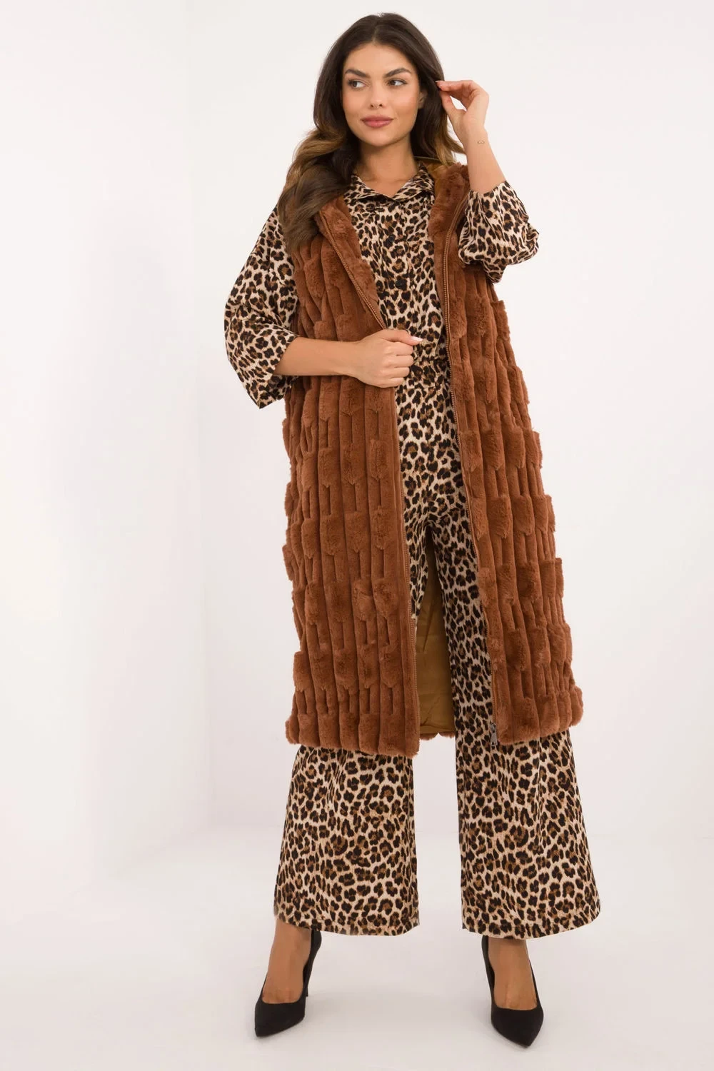Vytvořená s ohledem na ženy, které ocení eleganci a pohodlí, tato kožešinová vesta je výjimečným prvkem vašeho šatníku. Vesta je dokonalým spojením elegance a pohodlí. Její šlechtický design z ní dělá ideální k nošení v formálních situacích, do práce nebo na důležité obchodní schůzky. Díky svému vkusnému charakteru se vesta skvěle hodí jako součást pracovního oblečení a na významné příležitosti, dodávající vaší stylizaci výjimečný charakter. Vesta je vyrobena z odolného a snadno ošetřitelného polyesteru. Tento materiál nejen vypadá luxusně, ale také zajišťuje pohodlí při nošení. Kožešinová vesta je určena na chladnější dny a skvěle chrání před chladem, zároveň dodává eleganci každému stylu. Vesta je vybavena jemnou, ale účinnou izolací, což ji činí nejen módním doplňkem, ale také funkčním prvkem šatníku na zimní dny. Délka vesty sahající před kolena dodává celkovému vzhledu eleganci a zvýrazňuje subtilitu střihu. Dalším prvkem, kterým je kapuce, dodává vestě trochu neformálnosti a zároveň chrání před chladem a větrem. Pohodlné zapínání na zip umožňuje rychlé a snadné přizpůsobení vesty měnícím se povětrnostním podmínkám. Funkční vložené kapsy jsou praktickým doplňkem, umožňujícím uložení nejnutnějších drobností. Tato kožešinová vesta není jen módním prvkem šatníku, ale také praktickou volbou na zimní dny, která vám umožní cítit se elegantně a výjimečně v každé situaci.