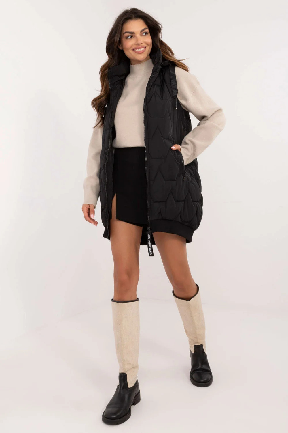 Dámská prošívaná vesta je praktickou a stylovou volbou pro chladnější dny. Je vyrobena z polyesteru se syntetickou výplní a zateplením, které poskytují tepelný komfort pro podzimní, zimní a jarní období. Je vybavena kapsami na zip, které jsou funkční i estetické. Vesta v délce před kolena je ideální pro každodenní nošení, do práce i na běžné vycházky. Navíc je vybavena odnímatelnou kapucí, takže vám dává možnost přizpůsobit se měnícím se povětrnostním podmínkám.