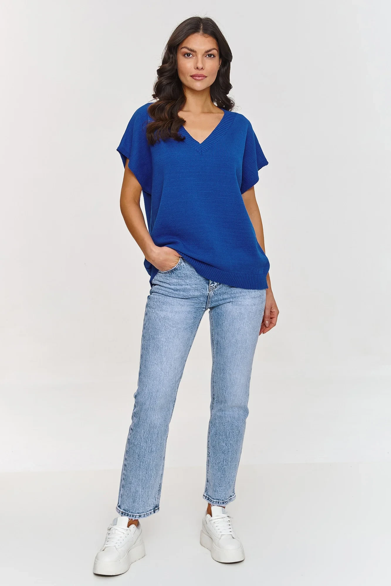 Tato svetrová vesta je stylový a pohodlný kus oblečení, který jistě přidá čerstvost každému outfitu. Vyrobená z měkkého materiálu poskytuje pohodlí po celý den. Výstřih ve tvaru V je jedním z nejvíce elegantních a univerzálních střihů, který jemně prodlužuje krk a dodává lehkost celému outfitu. Model má volný, oversized střih, který skvěle padne k různým typům postav, zajišťuje pohodlí a volnost pohybu. Krátký rukáv ve formě širokých rukávů přidává módní, ležérní akcent, který je ideální na teplejší dny a také se skvěle hodí k vrstvení na chladnější dny. Vyrobená z směsi vláken, včetně PBT, vesta má výjimečné vlastnosti. PBT je vláknem, které si dlouho udržuje svůj tvar a strukturu, což zajišťuje, že neztrácí na estetice a je odolnější. Díky elasticitě PBT se model skvěle přizpůsobí postavě, zajišťuje pohodlí a komfort po celý den. Svetrová vesta nejen vypadá módně, ale je také funkční a pohodlná. Můžete ji kombinovat s různými kousky oblečení, od ležérních džínů po elegantní sukně, vytvářející outfit na různé příležitosti.