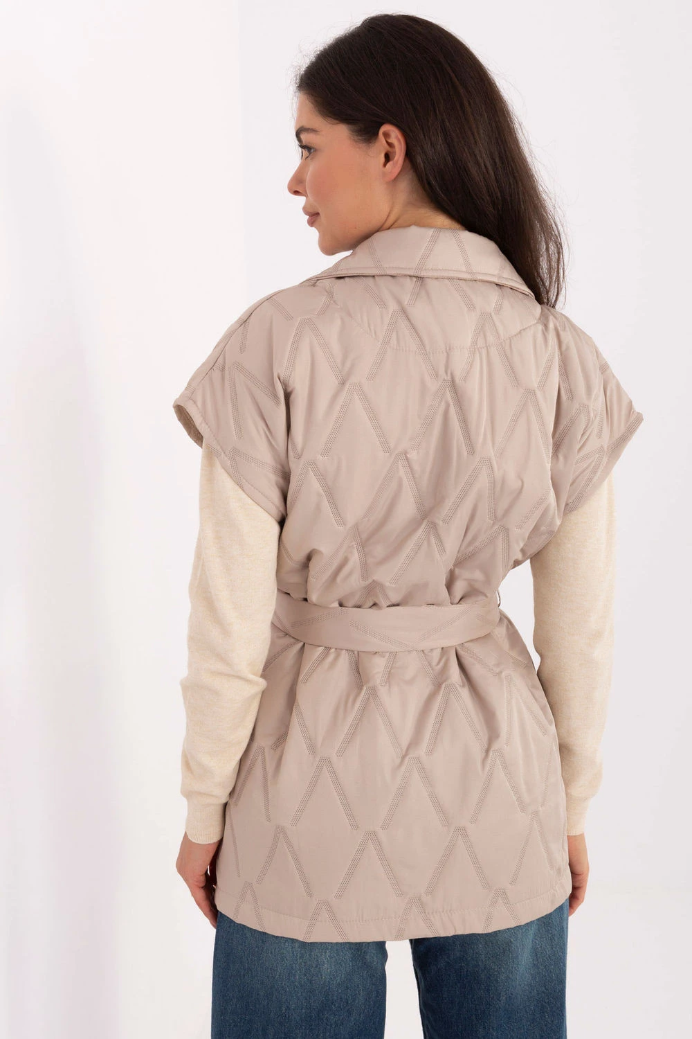 Elegantní dámský quiltovaný vestička standardní délky, zapíná se na knoflík a je vybavená klasickými límci. Vyrobená z polyesteru s syntetickou výplní, je lehká a pohodlná na nošení, zároveň je praktická v přechodném období ideální na podzim, zimu a jaro. Model se vyznačuje roztomilým quiltováním a různorodou strukturou materiálu, co mu dodává výjimečný charakter. V pasu je šňůrka k zavázání, která krásně zdůrazňuje postavu. Vložené kapsy přidávají funkčnost a brož na límci je elegantním, decentním akcentem. Je to ideální návrh na každý den a do práce spojující pohodlí, ženskou eleganci a nadčasový styl, vytvářející univerzální kus šatníku.