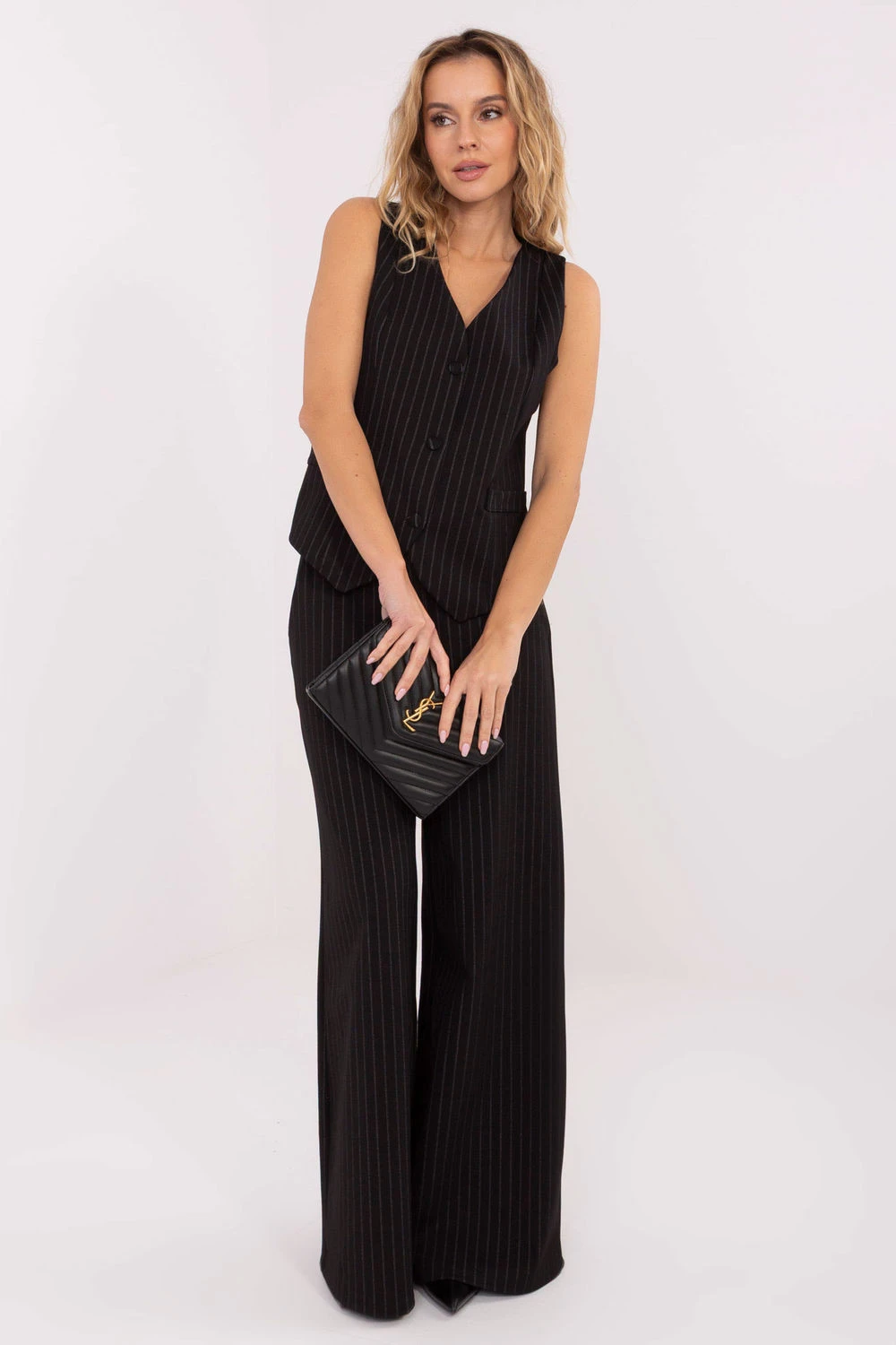 Elegantní dámský materiálový vest je stylovým doplňkem šatníku, který se skvěle hodí jak do každodenního života, do práce, tak i na společenské události. Jeho pruhovaný vzor přidává moderní a zeštíhlující efekt a dělá z něj skvělý doplněk jak k elegantním kalhotám, tak i ke sukni. Model je vyroben z vysoké kvality směsi nylonu, polyesteru, elastanu a viskózy, díky čemuž je vesta pohodlná, dobře sedí na postavě a udržuje svůj tvar. Standardní délka zajistí klasický a nadčasový vzhled, a absence rukávů jí dodá lehkost a umožní vytvářet mnoho stylových kombinací. Klasické knoflíkové zapínání zdůrazňuje elegantní charakter modelu a vnitřní podšívka zvyšuje pohodlí nošení a svědčí o pečlivém zpracování. Jedná se o vestu, která skvěle doplní jak kancelářské, tak i formální stylizace, dodávají jim eleganci a charakter.