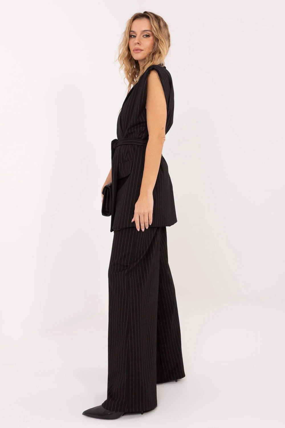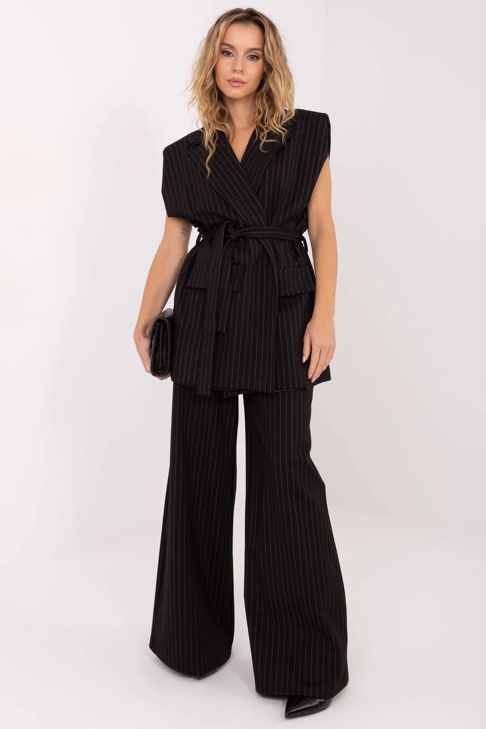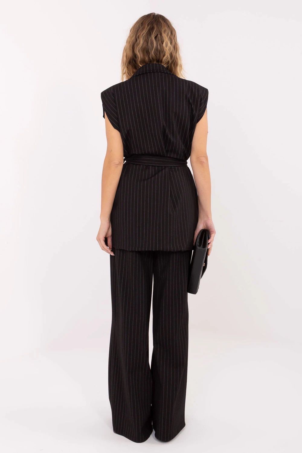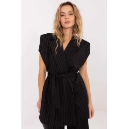Elegantní dámský materiálový vest je ideální volbou na formální události a do práce, když záleží na spojení elegance a moderního designu. Pruhovaný vzor jí dodává štíhlý, klasický charakter a zároveň zdůrazňuje výjimečný styl. Model je vyroben z vysoce kvalitní směsi nylonu, elastanu, viskózy a polyesteru, díky čemuž je vesta lehká, pohodlná a skvěle padne na postavě. Standardní délka a volnější střih jí dodávají přirozený vzhled a zároveň velmi elegantní. Vesta nemá tradiční zapínání, místo toho je vybavena páskem k uvázání, který umožňuje přizpůsobit střih postavě a vytvářet různé variace stylizace. Všité polštářky na ramenou dodávají konstrukci výraznosti, zdůrazňují linii ramen a dodávají profesionální, elegantní vzhled. Vnitřní podšívka zajišťuje pohodlí nošení a zvyšuje kvalitu zpracování. Jedná se o výjimečný vest, který skvěle doplní elegantní stylizace, dodávají jim charakter a moderní nádech.