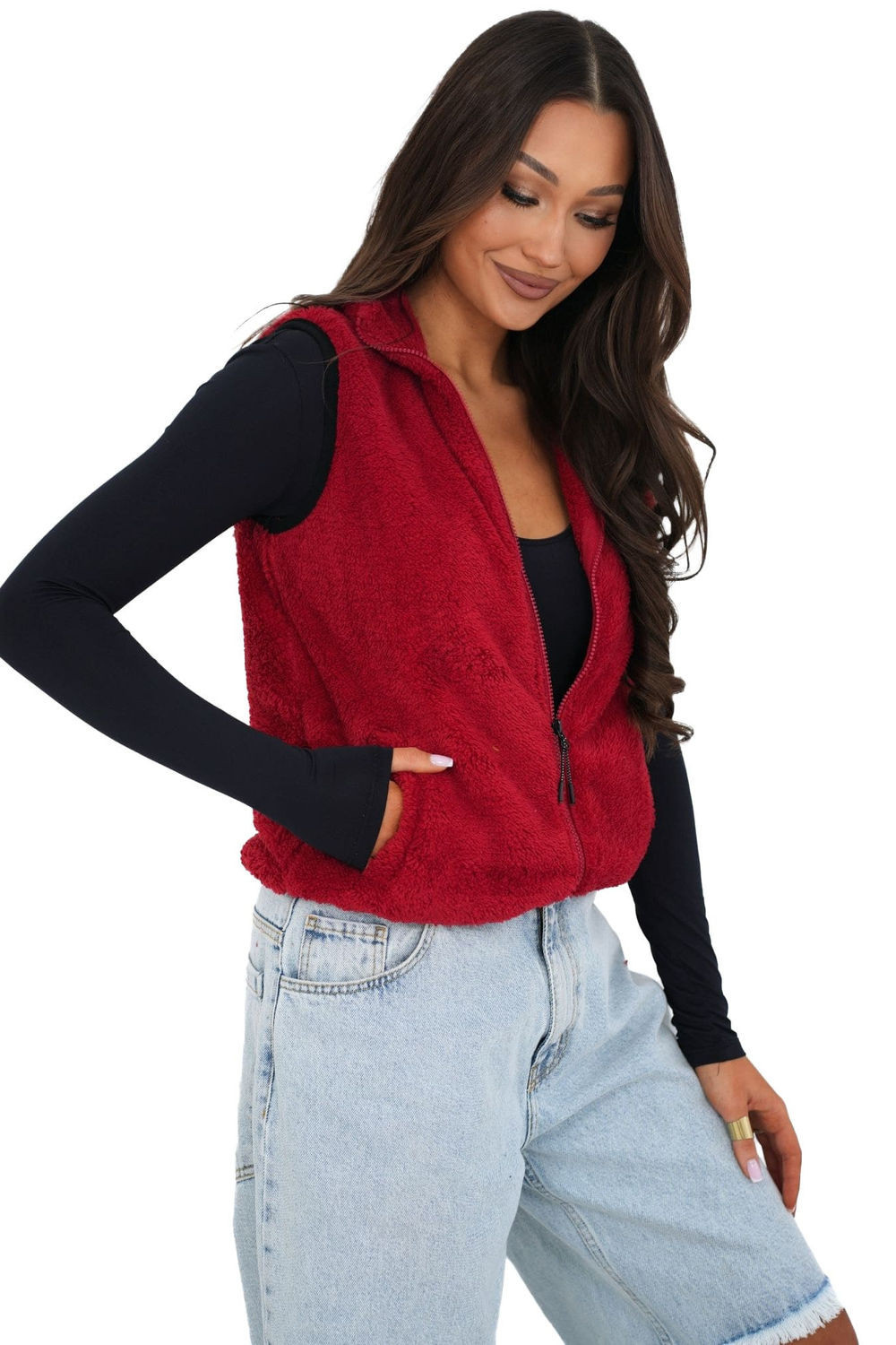Elegantní dámský vestovník s casual charakterem, ideální na každý den. Vyrobený z měkkého, kožešinového materiálu s dominujícím polyesterem, který zajišťuje pohodlí a příjemné zahřátí v chladnějších dnech. Model se zapíná na praktický zip, je vybaven pohodlnými kapsami a elegantním límcem chránícím krk před větrem. Hladký vzor dává vestovníku univerzální vzhled, díky čemuž se snadno hodí k mnoha stylizacím. Standardní délka z něj dělá skvělý kousek na podzim, zimu a jaro, jak k svetrům, tak i k halenkám nebo košilím. Model bez podšívky je ideální pro vrstvené outfit.