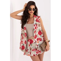 Dámský květovaný vest je elegantním prvkem šatníku, který se skvěle hodí jak na každodenní nošení do práce, tak i na formální události nebo večírky. Kombinace klasického střihu s ženským květinovým motivem dodává outfitu jedinečný charakter. Model je vyroben z polyesteru a elastanu, co zajišťuje pohodlí, lehkost a skvělé přizpůsobení se postavě. Standardní délka vesty se skvěle kombinuje jak se kalhotami, tak i sukněmi. Vest má límce a nápadné kapsy, které zdůrazňují její elegantní styl. Dvojitý řadový uzávěr na knoflíky dodává celému outfitu eleganci a nadčasový vzhled, zároveň modelující postavu. Ideální volba pro ženy, které ocení eleganci, pohodlí a módní design s jemným květinovým akcentem.
