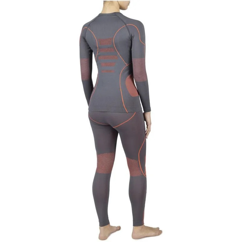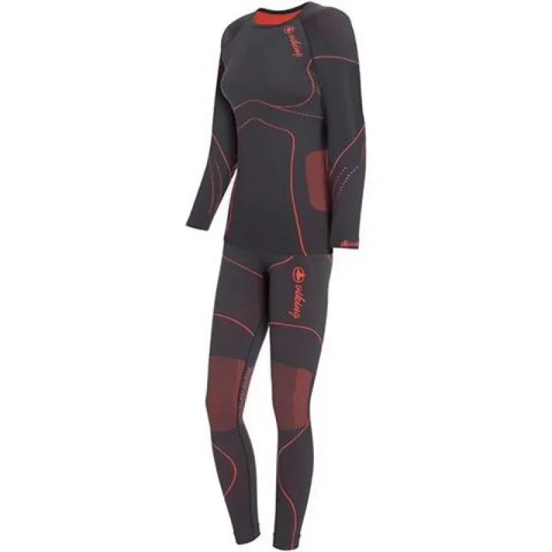 - Korálové detaily podtrhují sportovní styl a přiléhavý střih šedého termoprádla, které se hodí jako základní vrstva pod lyžařskou kombinézu i jako samostatný fitness outfit.