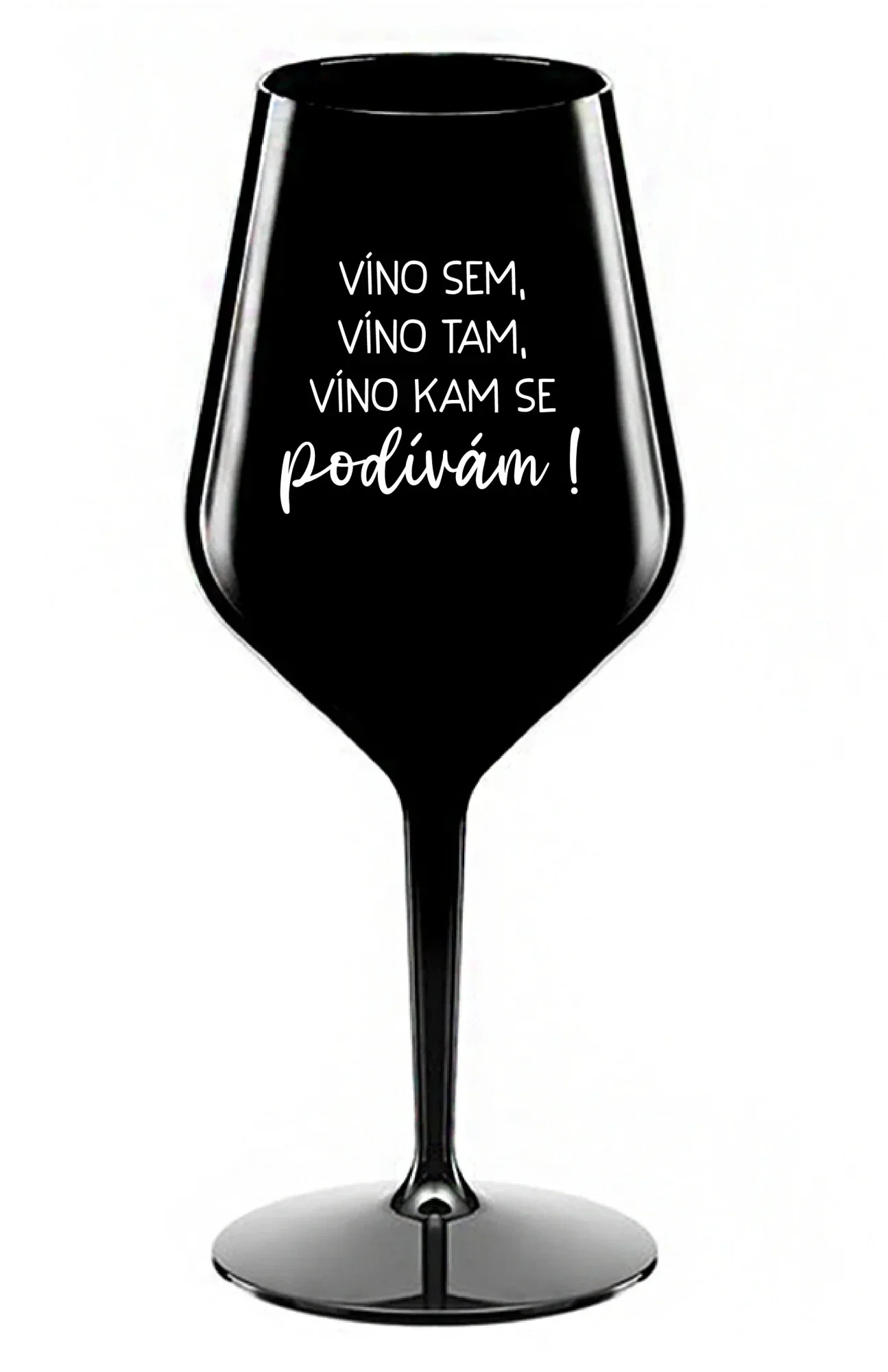 VÍNO SEM, VÍNO TAM, VÍNO KAM SE PODÍVÁM! - černá nerozbitná sklenice na víno 470 ml