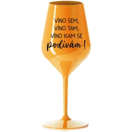 VÍNO SEM, VÍNO TAM, VÍNO KAM SE PODÍVÁM! - oranžová nerozbitná sklenice na víno 470 ml