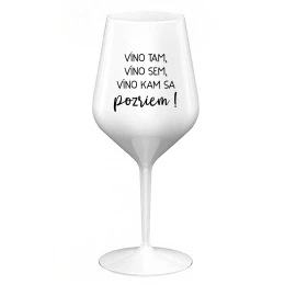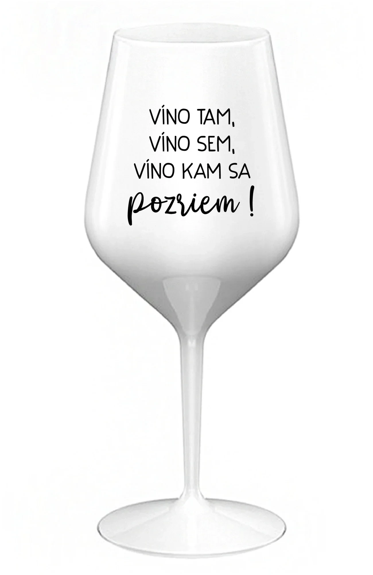 VÍNO TAM, VÍNO SEM, VÍNO KAM SA POZRIEM! - biely nerozbitný pohár na víno 470 ml
