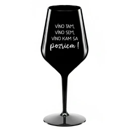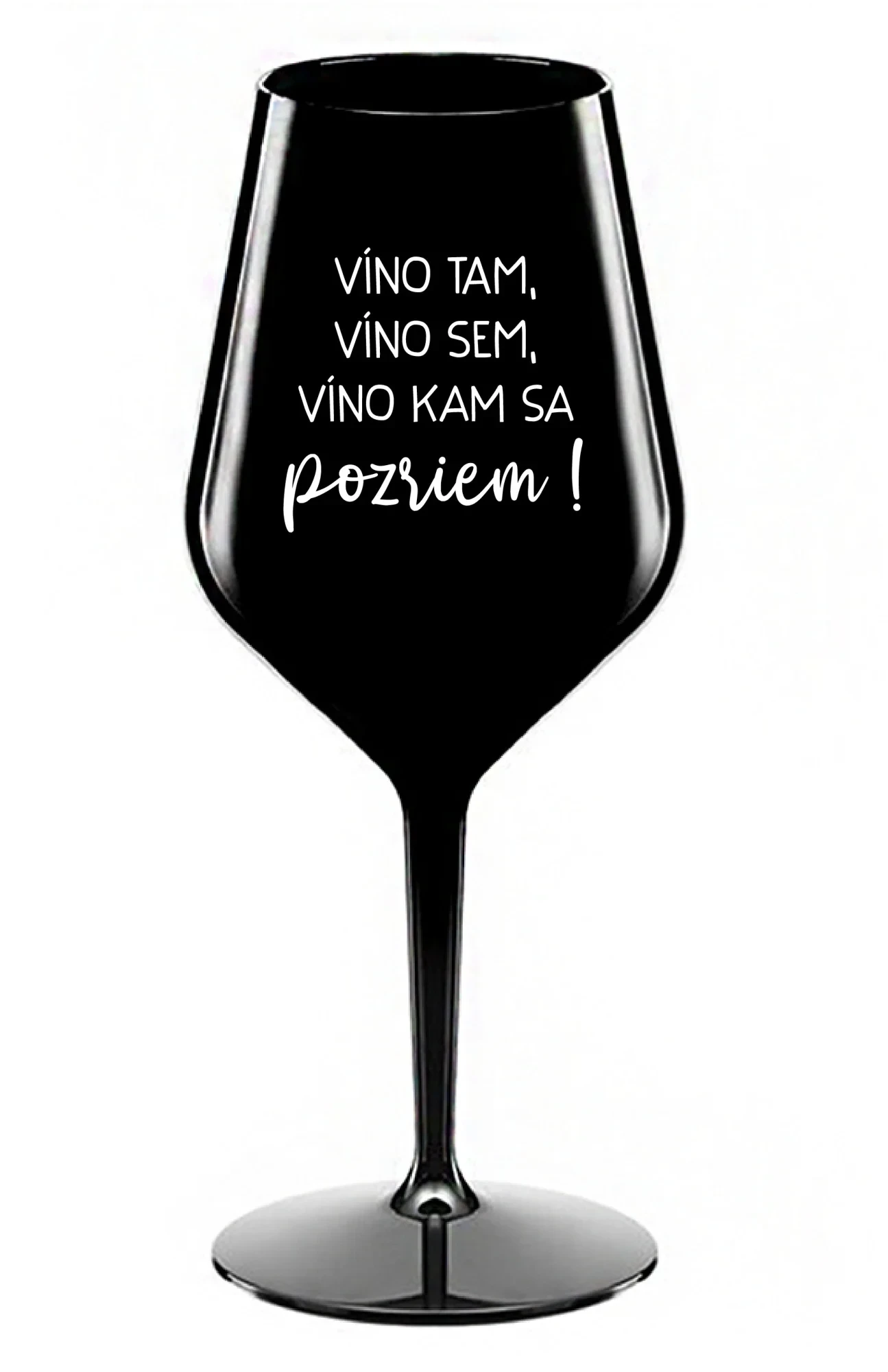 VÍNO TAM, VÍNO SEM, VÍNO KAM SA POZRIEM! - čierny nerozbitný pohár na víno 470 ml