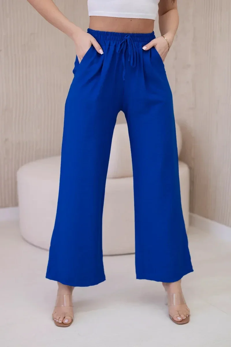 Široké viskózové kalhoty jsou jedinečným kouskem oblečení, který kombinuje pohodlí a eleganci. Tyto kalhoty vyrobené z lehkého a vzdušného viskózového materiálu zaručují nejen svobodu pohybu, ale také vám udrží pocit lehkosti a svěžesti po celý den. Široká nohavice dodává kalhotám charakteristický, volný střih, který je módní i pohodlný. Díky tomuto prvku vypadají kalhoty mimořádně stylově a působivě a dodává originalitu každému stylu. Univerzální design širokých kalhot je předurčuje pro různé příležitosti a styly. Můžete je nosit jak ke každodennímu ležérnímu outfitu, tak k elegantnějším soupravám na pracovní schůzky nebo večerní výlety. Široké viskózové kalhoty jsou perfektní volbou pro ženy, které oceňují pohodlí a styl. Díky univerzálnímu designu a kvalitnímu zpracování jsou tyto kalhoty nenahraditelným kouskem šatníku, který skvěle doplní každou kolekci oblečení. Velikost je univerzální a bude vhodná pro ženy, které nosí velikost S, M nebo L.