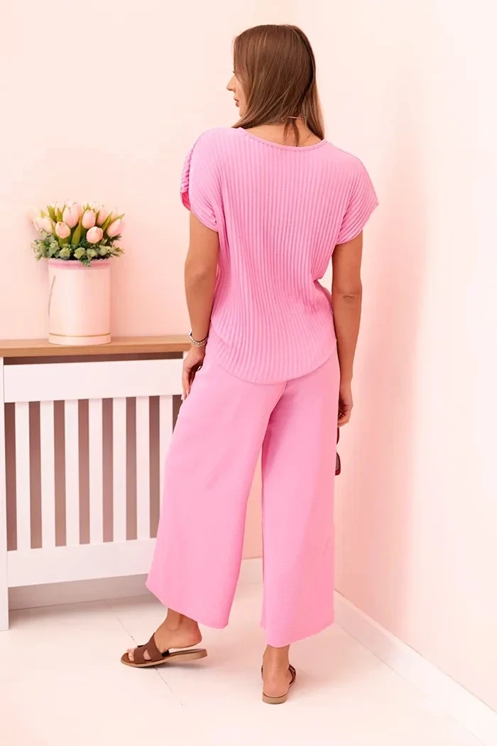 Viskózový komplet plisovaná halenka + kalhoty bonbónově růžová