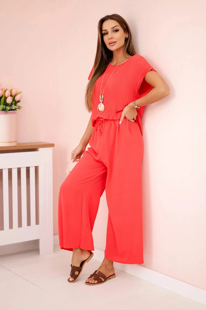 Objevte jedinečný komplet, který spojuje pohodlí a eleganci a vytváří dokonalý outfit pro každou příležitost. Vyrobený z lehké a prodyšné viskózy, poskytuje maximální komfort při nošení a zároveň vypadá velmi stylově. Plisovaná halenka s volným střihem jemně podtrhuje siluetu a dodává jí lehkost a moderní vzhled. Široké kalhoty dokonale ladí s halenkou a zajišťují volnost pohybu i elegantní vzhled. Celý komplet doplňuje ozdobný náhrdelník, který přidává jedinečný stylový prvek a eliminuje potřebu dalších doplňků. Tento set je ideální jak pro formální setkání, tak i pro každodenní nošení, kdy chcete vypadat elegantně, ale zároveň se cítit pohodlně. Vyberte si komplet z viskózy a užívejte si lehkost i nadčasový styl. Velikost je univerzální a vhodná pro ženy nosící velikosti S, M nebo L.