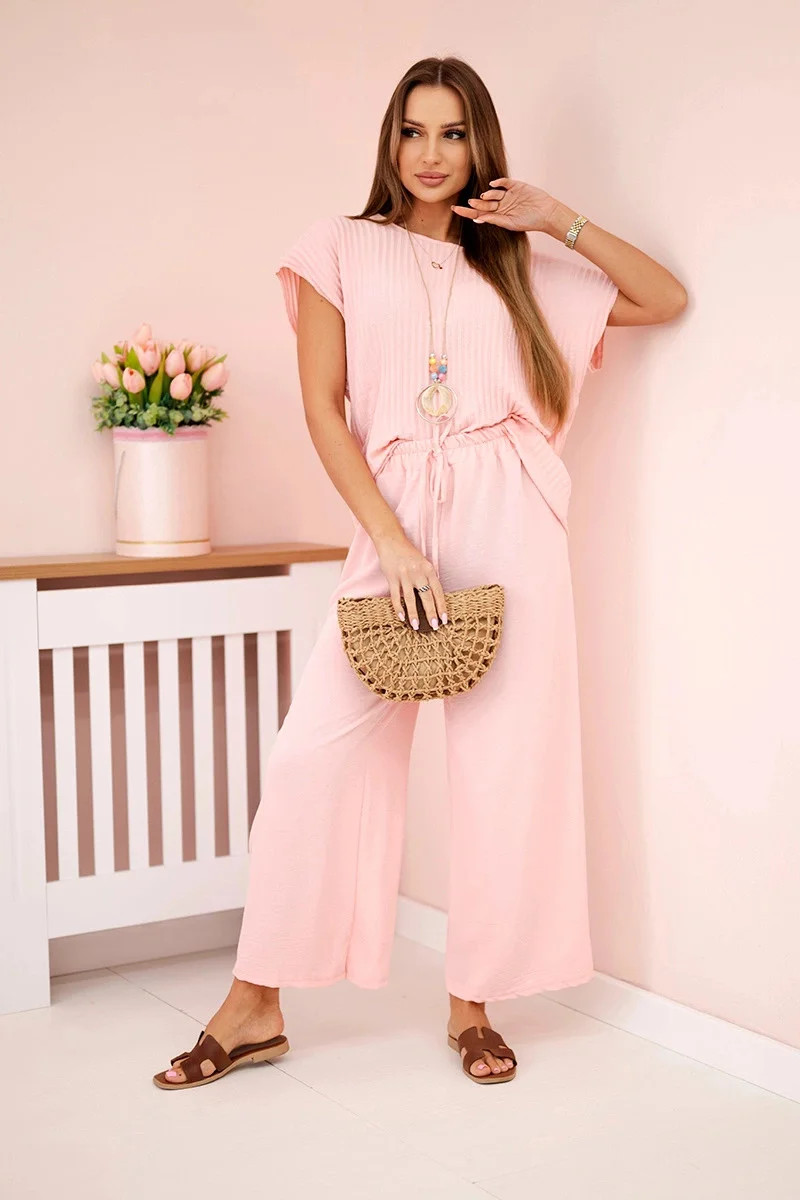 Viskózový komplet plisovaná halenka + kalhoty pudrově růžová