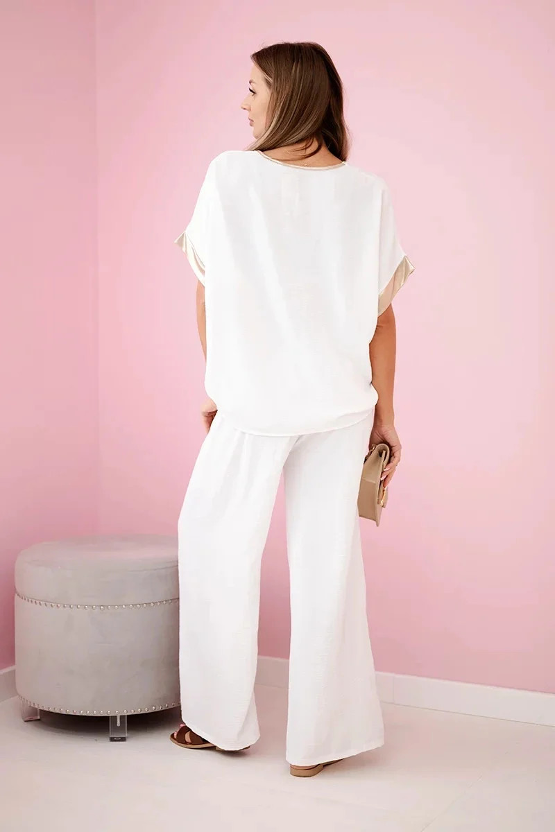 Tento jedinečný komplet spojuje pohodlí a elegantní styl, což z něj činí ideální volbu pro ženy, které ocení jemné, ale výrazné akcenty. Vyrobený z lehké, prodyšné viskózy, zajišťuje maximální pohodlí po celý den. Jemná tkanina krásně splývá s postavou a zvýrazňuje její přirozené přednosti. Zlaté lemování dodává celému outfitu výjimečný luxusní vzhled, přitahuje pozornost a přidává eleganci. Tento komplet je tak skvělou volbou jak pro každodenní nošení, tak i pro formálnější příležitosti. Můžete jej kombinovat s oblíbenými doplňky a vytvořit jedinečné styly odpovídající vašemu vkusu. Vyberte si viskózový komplet se zlatým lemováním a ciťte se elegantně a stylově v každé situaci. Velikost je univerzální a vhodná pro ženy nosící velikosti S, M nebo L.