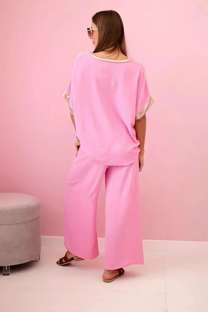 Tento jedinečný komplet spojuje pohodlí a elegantní styl, což z něj činí ideální volbu pro ženy, které ocení jemné, ale výrazné akcenty. Vyrobený z lehké, prodyšné viskózy, zajišťuje maximální pohodlí po celý den. Jemná tkanina krásně splývá s postavou a zvýrazňuje její přirozené přednosti. Zlaté lemování dodává celému outfitu výjimečný luxusní vzhled, přitahuje pozornost a přidává eleganci. Tento komplet je tak skvělou volbou jak pro každodenní nošení, tak i pro formálnější příležitosti. Můžete jej kombinovat s oblíbenými doplňky a vytvořit jedinečné styly odpovídající vašemu vkusu. Vyberte si viskózový komplet se zlatým lemováním a ciťte se elegantně a stylově v každé situaci. Velikost je univerzální a vhodná pro ženy nosící velikosti S, M nebo L.