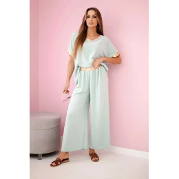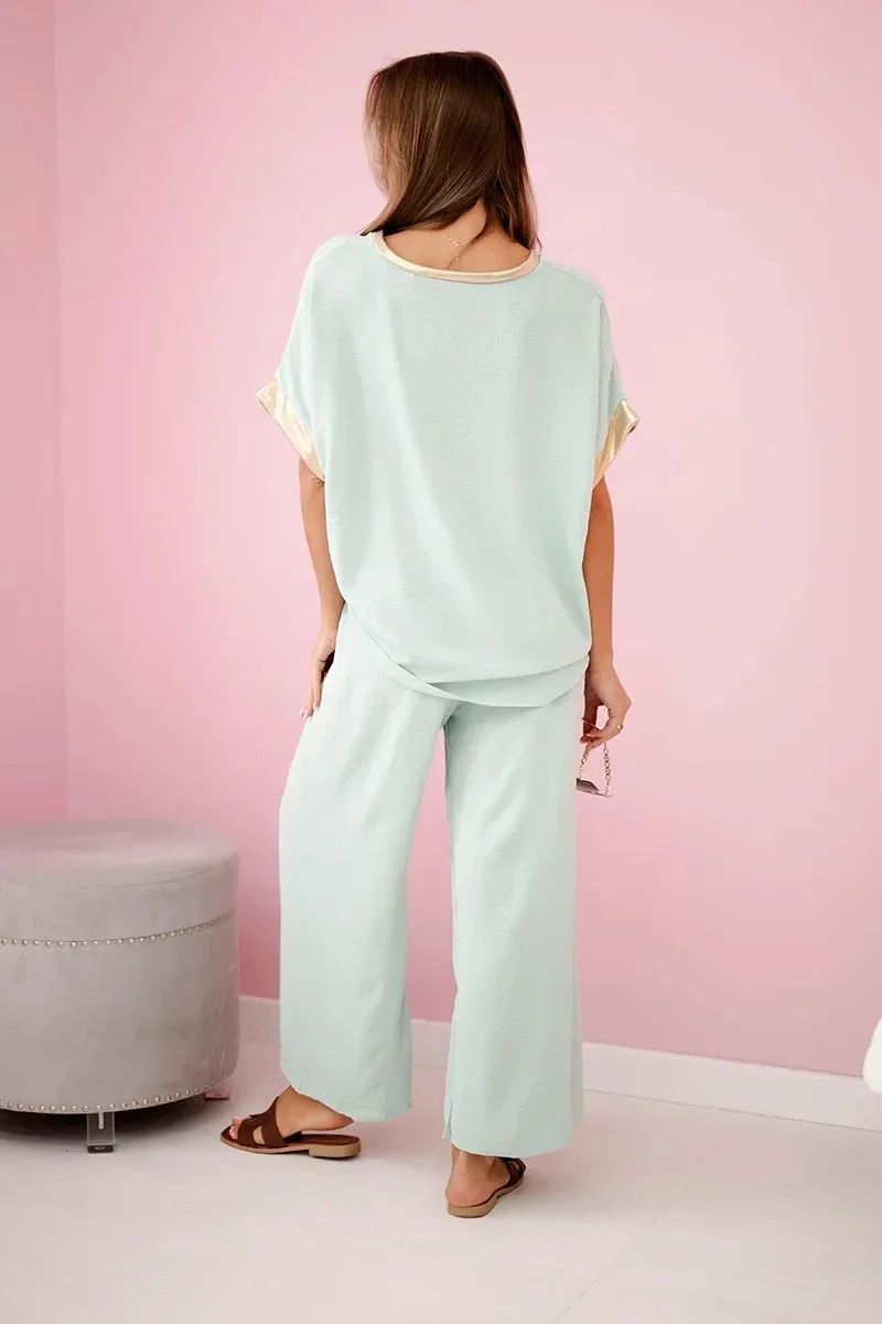 Tento jedinečný komplet spojuje pohodlí a elegantní styl, což z něj činí ideální volbu pro ženy, které ocení jemné, ale výrazné akcenty. Vyrobený z lehké, prodyšné viskózy, zajišťuje maximální pohodlí po celý den. Jemná tkanina krásně splývá s postavou a zvýrazňuje její přirozené přednosti. Zlaté lemování dodává celému outfitu výjimečný luxusní vzhled, přitahuje pozornost a přidává eleganci. Tento komplet je tak skvělou volbou jak pro každodenní nošení, tak i pro formálnější příležitosti. Můžete jej kombinovat s oblíbenými doplňky a vytvořit jedinečné styly odpovídající vašemu vkusu. Vyberte si viskózový komplet se zlatým lemováním a ciťte se elegantně a stylově v každé situaci. Velikost je univerzální a vhodná pro ženy nosící velikosti S, M nebo L.