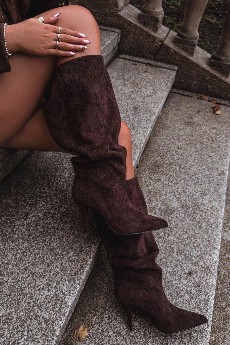 Vklouzávací dámské kozačky na jehlovém podpatku z eko semiše čokoládové Noretta