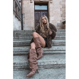 Dámské kozačky vyrobené z měkkého umělého semiše jsou elegantní a ženskou volbou na chladnější dny. Model na štíhlém podpatku krásně zvýrazňuje nohy a špičatý nos dodává šarm a opticky zeštíhluje postavu. Gáčková, volná špička dodává celku módní charakter. Boty jsou nazouvací a vyhřívané botníkem, což zajišťuje pohodlí a tepelný komfort. Tento velmi stylový střih skvěle doplní jak elegantní šaty, tak casual outfity s džínami, čímž vytváří módní a ženský vzhled. Při výběru velikosti prosíme, řiďte se tabulkou velikostí.