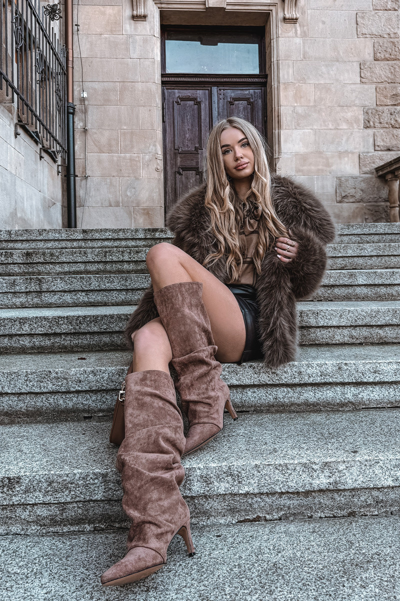 Dámské kozačky vyrobené z měkkého umělého semiše jsou elegantní a ženskou volbou na chladnější dny. Model na štíhlém podpatku krásně zvýrazňuje nohy a špičatý nos dodává šarm a opticky zeštíhluje postavu. Gáčková, volná špička dodává celku módní charakter. Boty jsou nazouvací a vyhřívané botníkem, což zajišťuje pohodlí a tepelný komfort. Tento velmi stylový střih skvěle doplní jak elegantní šaty, tak casual outfity s džínami, čímž vytváří módní a ženský vzhled. Při výběru velikosti prosíme, řiďte se tabulkou velikostí.