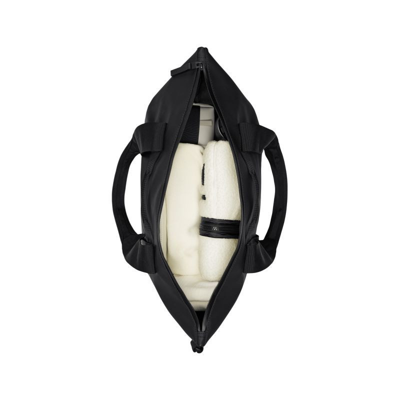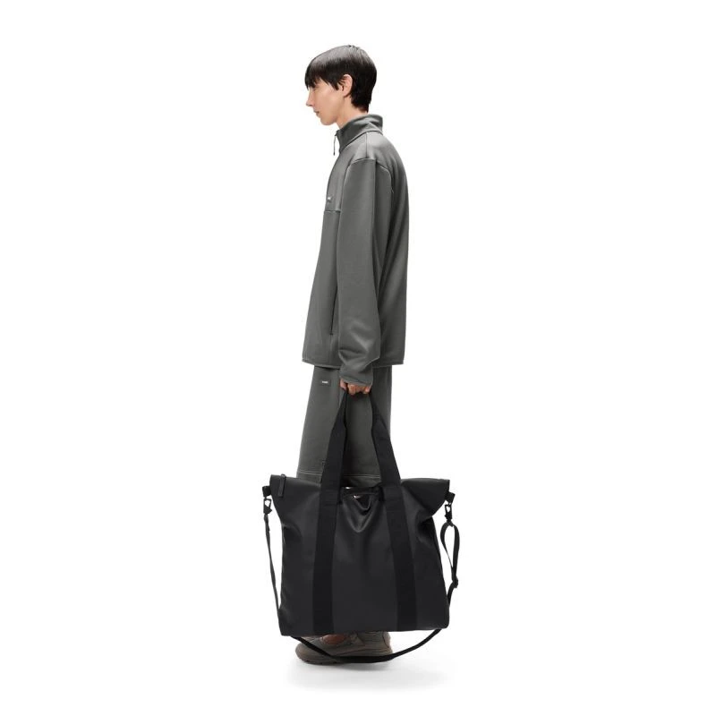 Tote Bag jest wykonana z charakterystycznej dla Rains tkaniny poliuretanowej, która zapewnia wytrzymałość, trwałość i gładkość w dotyku.