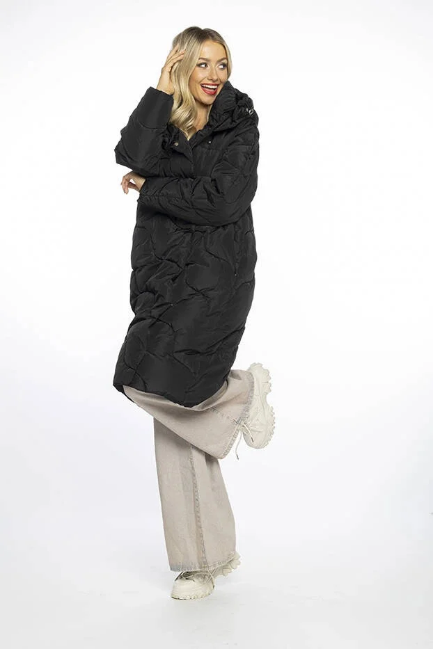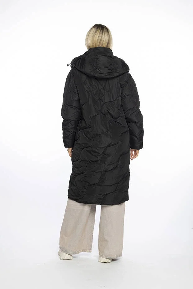 Bunda má volný střih, je zateplená vrstvou syntetické péřové výplně, má dvě kapsy se zapínáním na zip a zapíná se dvojitým zipem a panelem s patentkami. Model má kapuci, kterou není možné odepnout. Bunda má délku pod kolena.