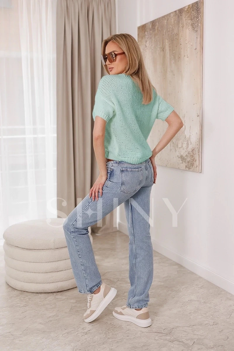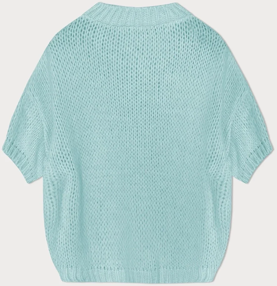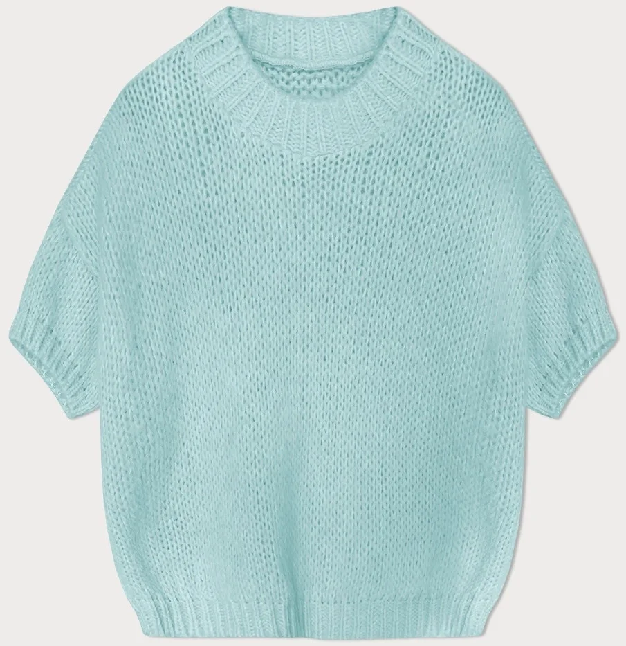 Svetr je ažurový, má krátké rukávy a délku k bokům.