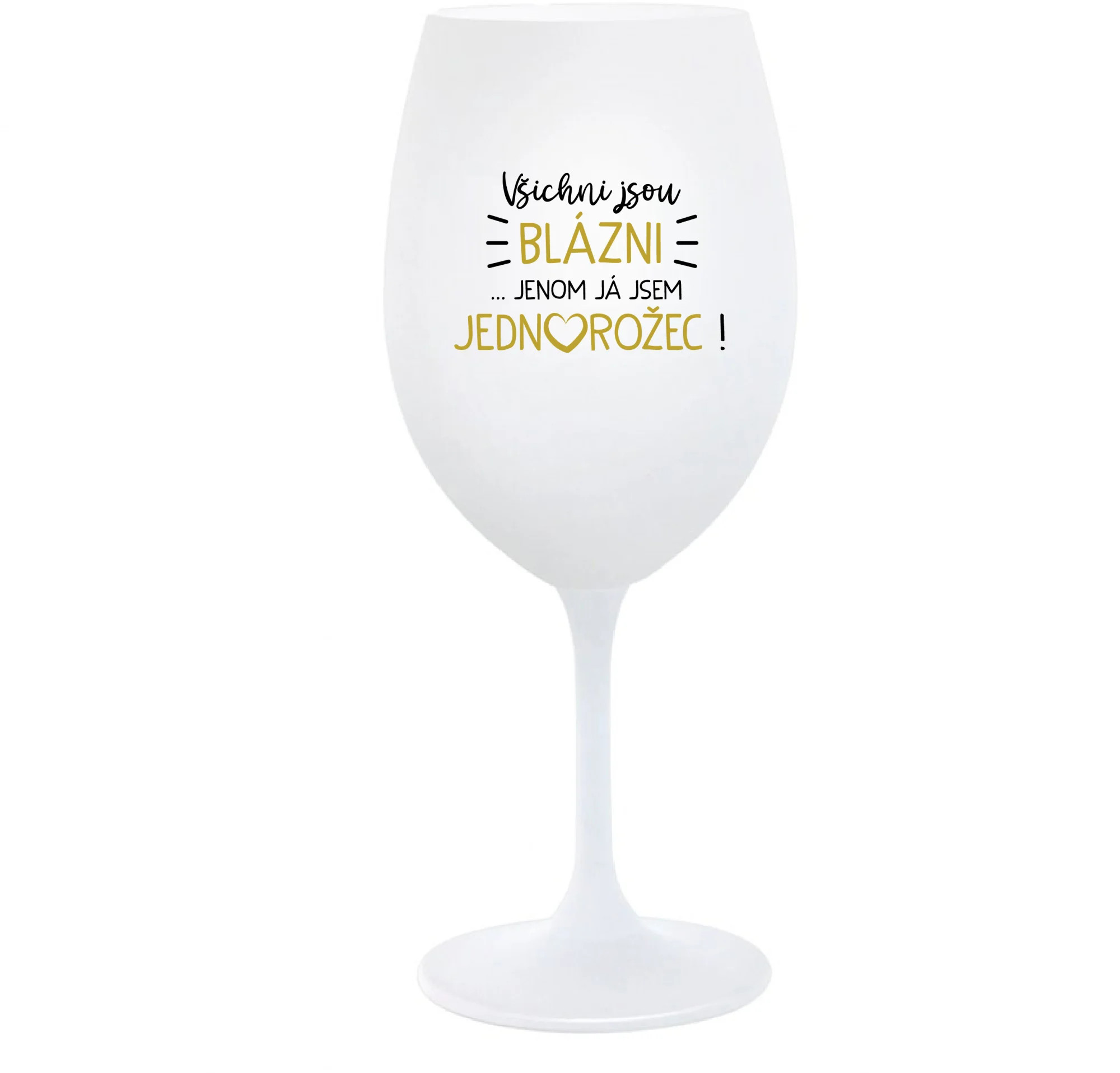 VŠICHNI JSOU BLÁZNI...JENOM JÁ JSEM JEDNOROŽEC! - bílá sklenice na víno 350 ml