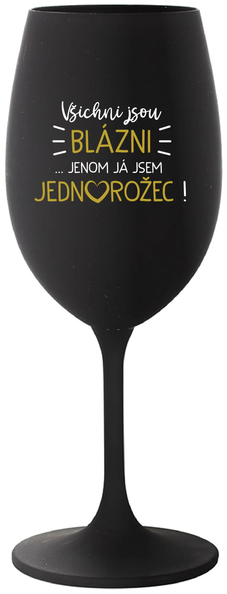 VŠICHNI JSOU BLÁZNI...JENOM JÁ JSEM JEDNOROŽEC! - černá sklenice na víno 350 ml