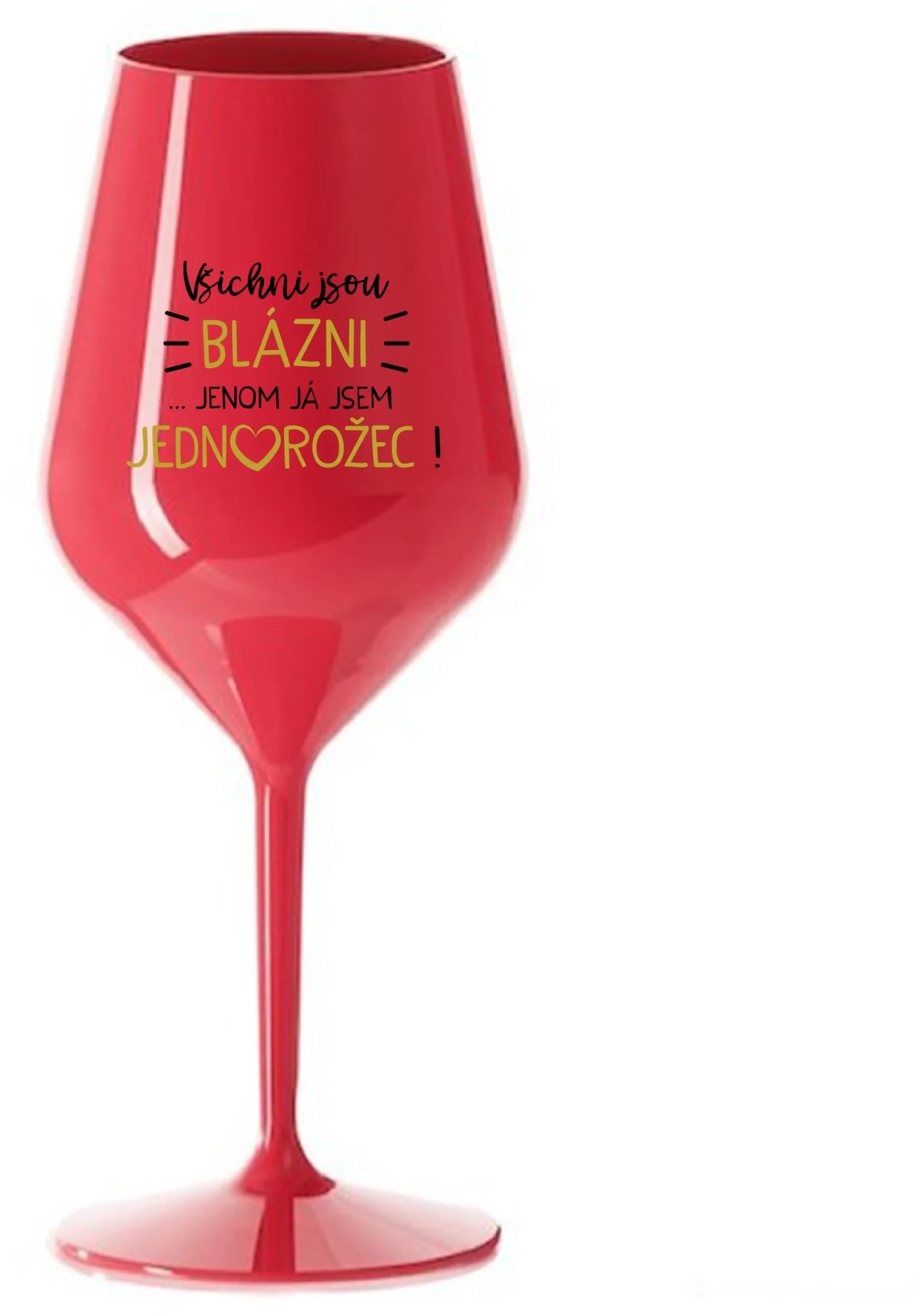 VŠICHNI JSOU BLÁZNI...JENOM JÁ JSEM JEDNOROŽEC! - červená nerozbitná sklenice na víno 470 ml