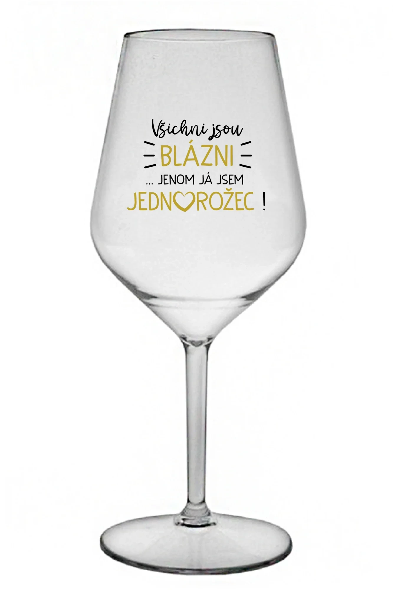 VŠICHNI JSOU BLÁZNI...JENOM JÁ JSEM JEDNOROŽEC! - čirá nerozbitná sklenice na víno 470 ml