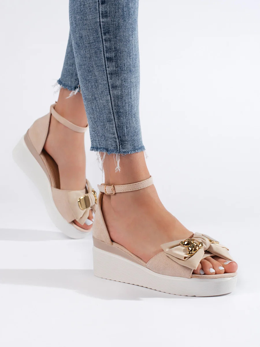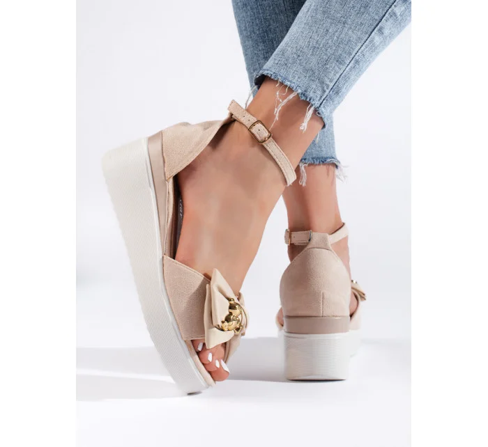 Stylové dámské pantofle z eko semiše. Usazené na jemném klínu a platformě. Měkká stélka zajišťuje pohodlí po celý den. Vpředu je jemný ozdobný detail, který dodává výjimečný charakter. Ideální na teplé dny, tyto pantofle se skvěle hodí k letním šatům, sukním a kalhotám, vnášejí lehkost do každého outfitu. Při výběru velikosti se řiďte tabulkou velikostí.