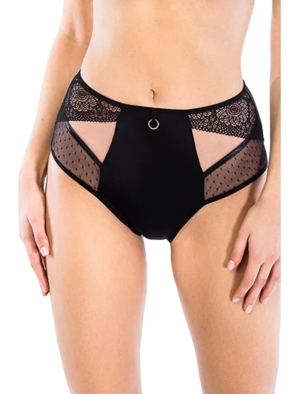 Přední díl kalhotek zdobí vsadky z tylu a krajky a prošití černou páskou. Zadní díl modelu je ušitý z černého mikrovlákna. Nohavičky jsou olemované dvojitým tylem. Krajka a doplňky jsou vyrobené z velmi kvalitních francouzských materiálů.