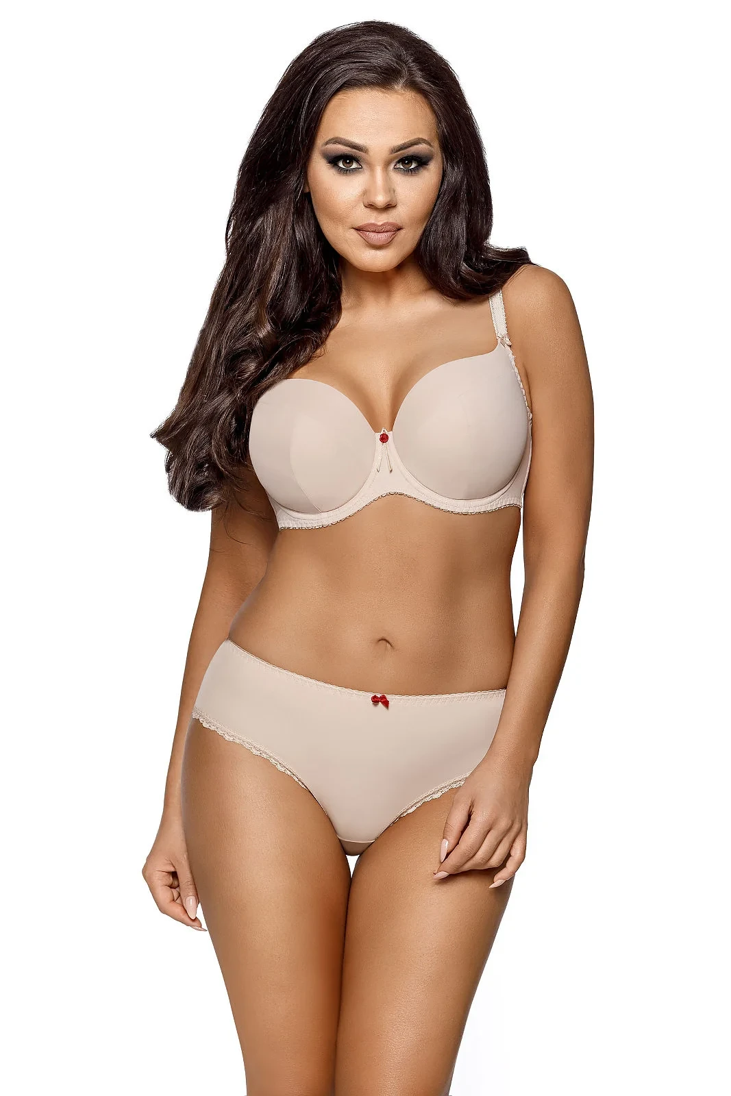 Zobrazit popis > Vyztužená podprsenka se svislým a šikmým střihem. Ušitá je z hladkého mikrovlákna. Mezi košíčky je saténová mašlička. Boky jsou zpevněné svislou kosticí. Ramínka jsou neodepínací. Model dobře podpírá a pozvedá prsa.