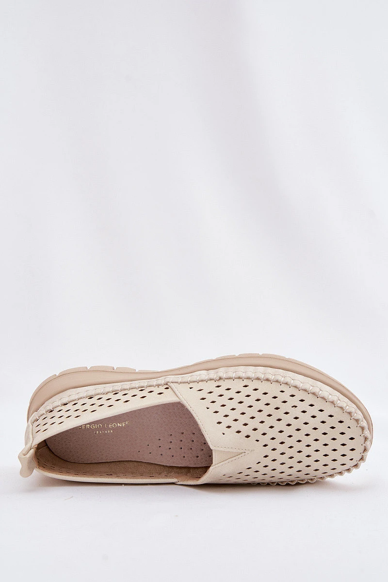 Dámské mokasíny Sergio Leone jsou mimořádně lehké a pohodlné, ideální pro každodenní nošení, zejména v teplejších dnech. Vrchní část je vyrobena s perforovaným vzorem, což zajišťuje prodyšnost a lepší cirkulaci vzduchu, čímž se zvyšuje komfort při nošení. Model se vyznačuje velmi lehkou konstrukcí, díky níž jsou mokasíny pohodlné i při delším používání. Vnitřek obuvi je vybaven vložkou z přírodní kůže, která se dobře přizpůsobí noze, zvyšuje komfort a pomáhá udržovat správnou hygienu uvnitř obuvi. Klasický střih je činí velmi univerzálními a snadno je sladíte s různými styly. Skvěle se hodí jak k nohavicím, džínům, tak i k šatům nebo sukním, představují pohodlnou a stylovou volbu na každý den. Při výběru velikosti se řiďte tabulkou velikostí.