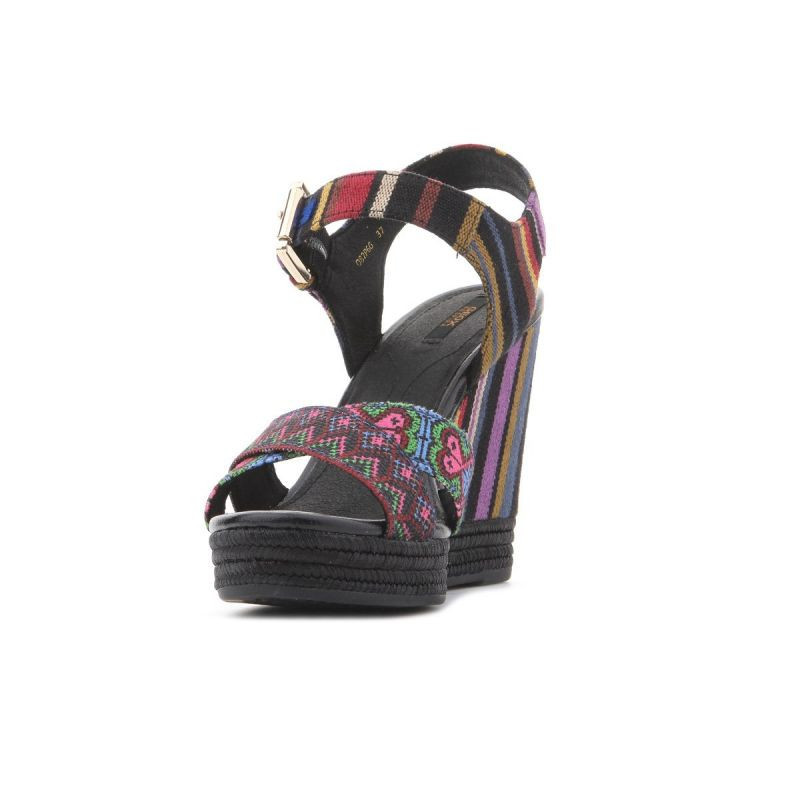 - Další zdobení zajišťuje zlatá přezka, která zároveň poskytuje možnost nastavení pásku u kotníku, a dvojitý černý copánkový povrch kolem podrážky.