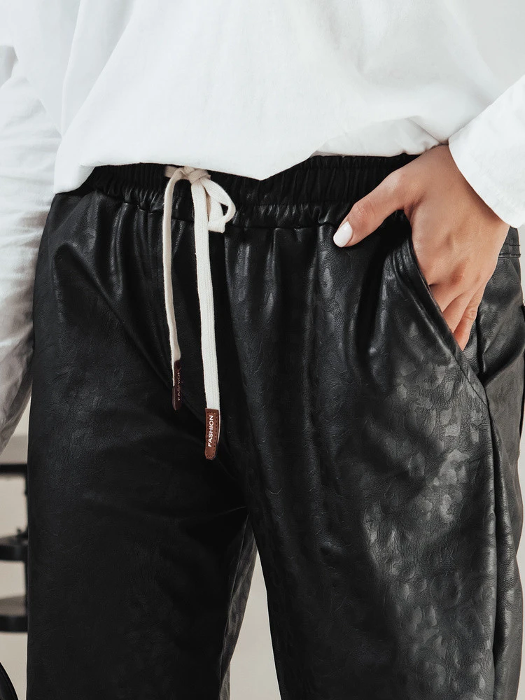 Kalhoty moderního střihu z materiálu imitujícího kůži, které spojují styl s funkčností. Elastický pas se zavazováním poskytuje pohodlí a módní detaily dodávají celku jedinečný charakter. Ideální na každodenní vycházky nebo večerní schůzky.