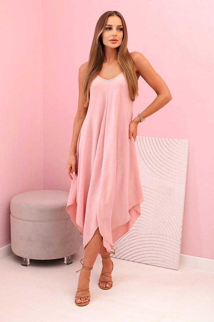 Tato dámské šaty na ramínka jsou ideální volbou pro ženy, které ocení pohodlí, lehkost a jemnou eleganci. Rozšířený střih krásně zdůrazňuje ženskou postavu a dodává každému pohybu lehkost. Díky mírně asymetrickému spodnímu lemu materiál efektně padá a vytváří půvabný vzhled. Tenká ramínka a výstřih do „V“ jemně zvýrazňují ramena a krk a dodávají šatům letní, romantický charakter. Šaty se skvěle hodí jak pro každodenní nošení, tak pro večerní výlety, procházky na dovolené nebo venkovní akce. Vyrobeny z lehkého, příjemného materiálu s příměsí elastanu, zajišťují volnost pohybu a pohodlí po celý den. Velikost je univerzální a hodí se pro dámy velikosti S, M nebo L.