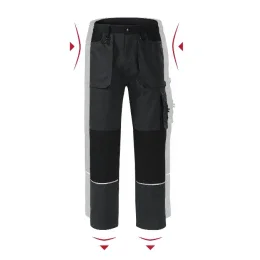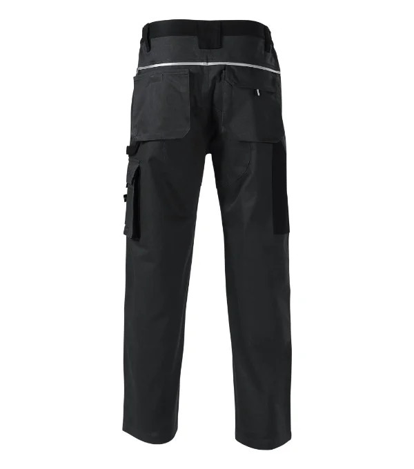 pruženka v boční části pasového límce 7 multifunkčních kapes zdvojený materiál v oblasti kolen a sedu plastové "D" poutko a karabina na klíče a ID karty poutko na kladivo dvojité prošití pro vyšší odolnost retroreflexní prvky