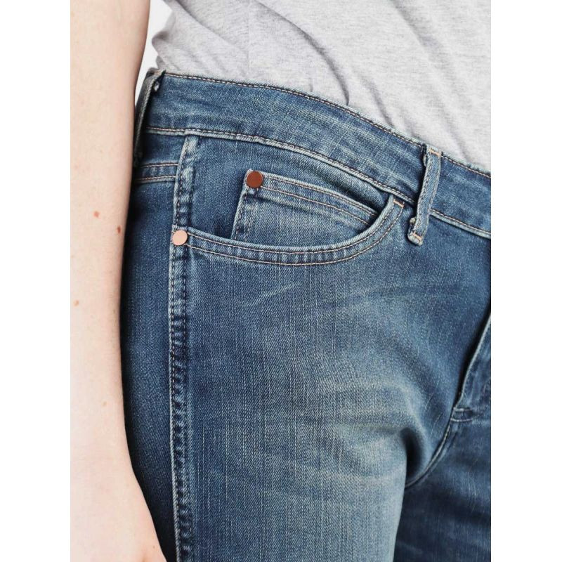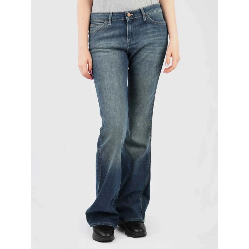Dámské džínové kalhoty typu hipster se širokými nohavicemi, zapínáním na zip a koženou nášivkou s logem výrobce na zadní kapse.